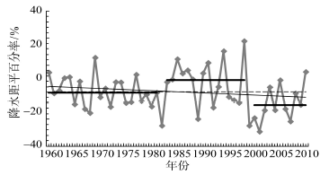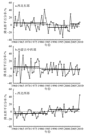 =0.05显著性水平的F检验),80年代中期前降水较常年同期偏少,之后转为偏多。滑动T检验检测表明,该区降水同样在1985/1986年发生突变,降水由前期偏少时期转为偏多时期。该结果与施雅风等(2003)提出西北地区1986年后增湿结论一致,增湿区域仅限于西北西部地区。Fig.3 Annual precipitation anomalies (%) for the three regions in Northwest China, 1960-2010图3 1960-2010年中国西北部各区降水距平百分率变化 |