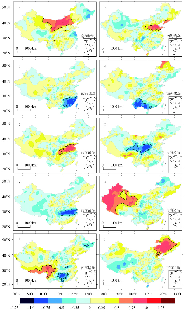 Fig.1 Spatial distributions of the first 10 rotated vector loadings for REOF图1 REOF前10个旋转向量空间分布场 |
