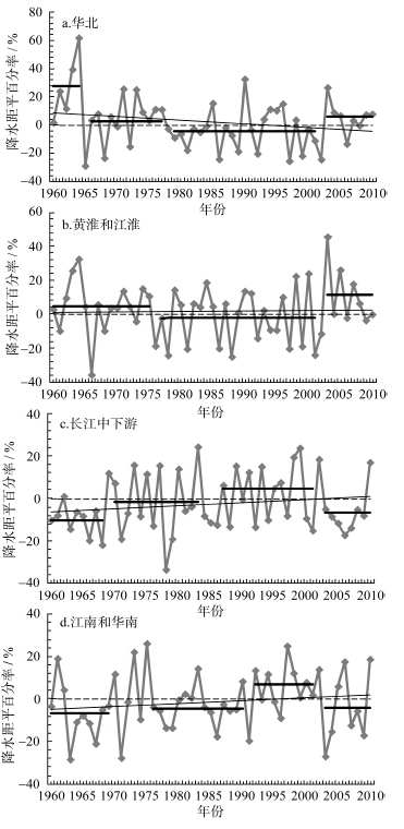 =0.05显著性水平的F检验。从东部各区降水的阶段性变化来看,70年代末之前,降水偏多区域主要位于华北、黄淮和江淮地区,70年代末-90年代降水偏多地区南移至长江中下游、江南和华南地区,而21世纪初降水偏多的地区又位于华北、黄淮和江淮地区。东部各区降水的阶段性变化主要反映为该区雨带的移动。Fig.2 Annual precipitation anomalies (%) for the four regions in East China, 1960-2010图2 1960-2010年中国东部各区年降水距平百分率变化 (直线为线性趋势线,虚线为零值,短粗直线为各区降水年代际转折时期降水距平百分率均值线,下同) |