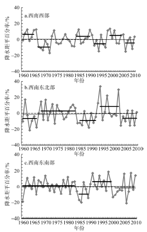 Fig.4 Annual precipitation anomalies (%) for each region in Southwest China, 1960-2010图4 1960-2010年中国西南部各区降水距平百分率变化 |
