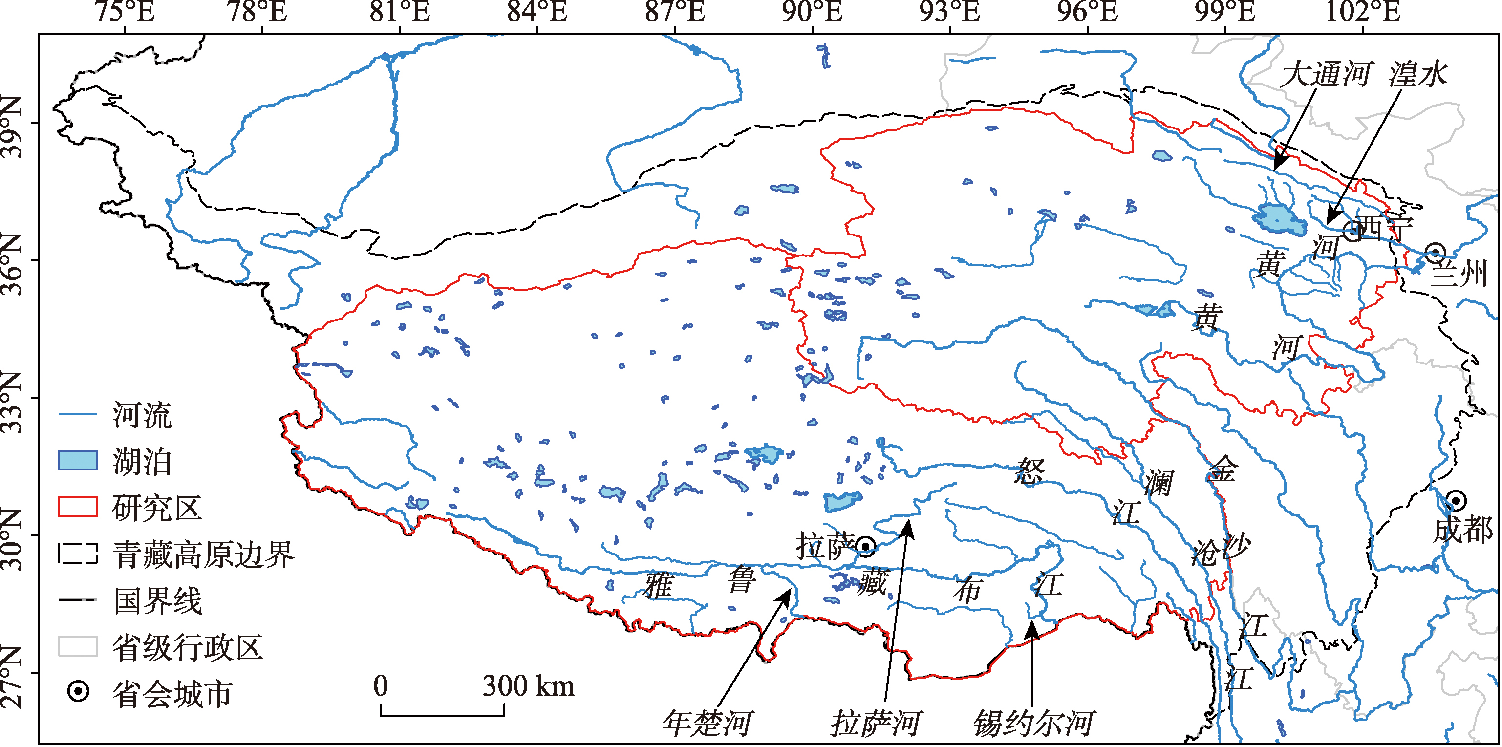 Fig.1 Location of the study area (the boundary of the Tibetan Plateau is based on Zhang et al (2014))图1 研究区示意图(青藏高原边界线数据引自(Zhang et al, 2014)) |