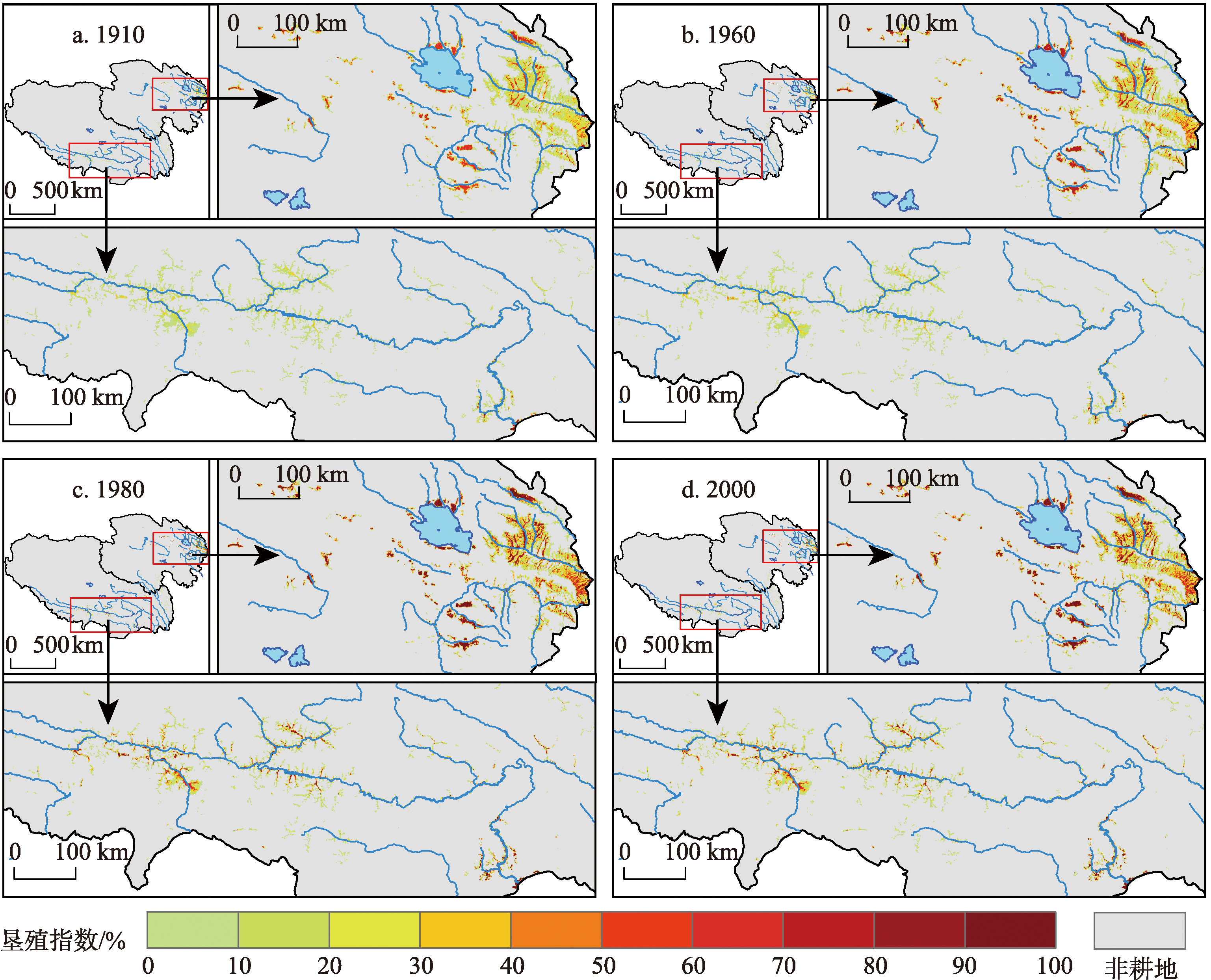 Fig. 4 Spatial patterns of cropland in Qinghai and Tibet at 1 km×1 km resolution in 1910, 1960, 1980, and 2000图4 1910、1960、1980和2000年青海和西藏1 km×1 km耕地空间格局 |