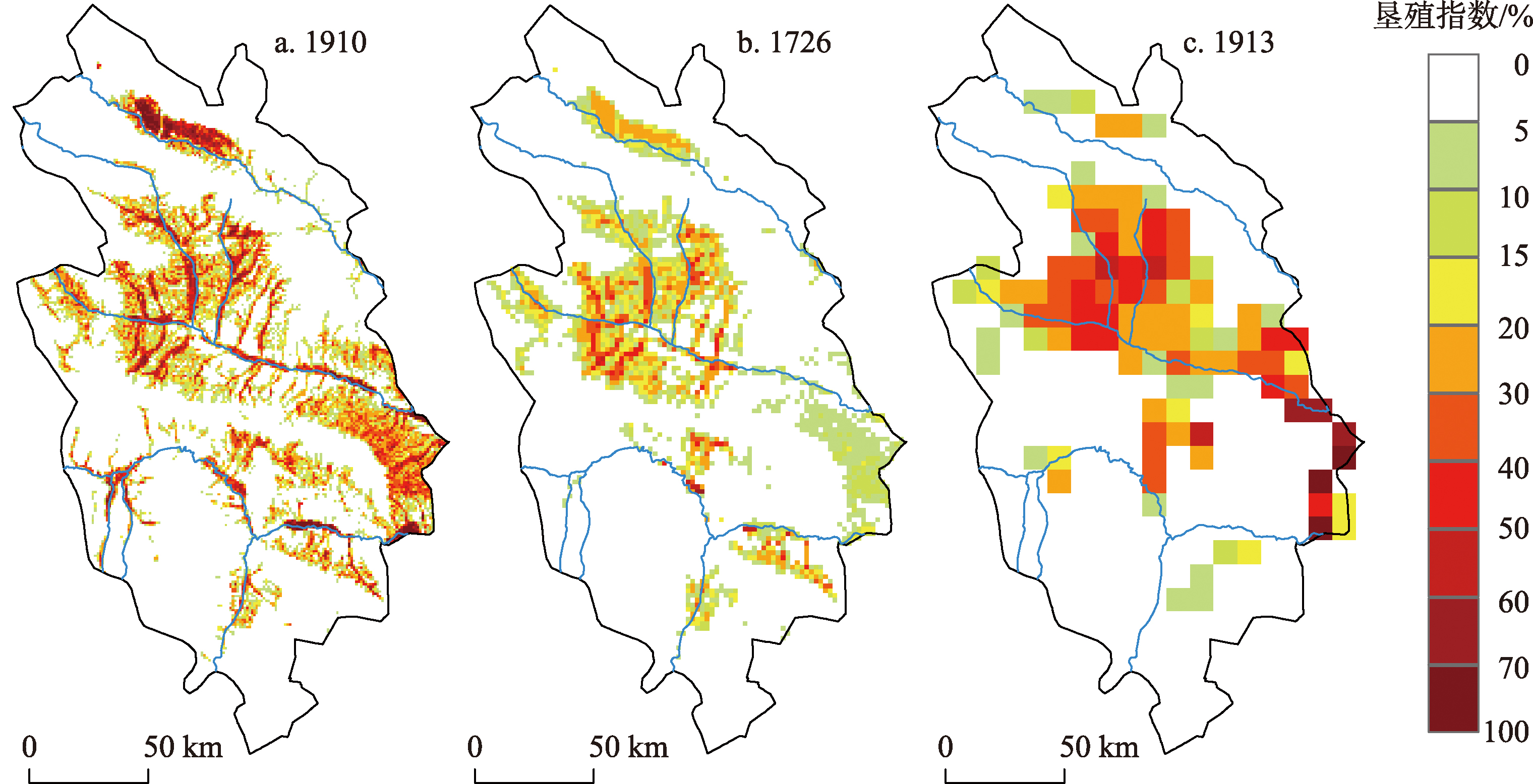 网格化的历史土地利用/覆被数据集,可为历史气候变化和碳循环研究提供基础数据。本文估算了1910年,并订正了1950-2000年青海和西藏的省域耕地面积数据;基于现代耕地空间格局,量化了海拔高程和地面坡度与耕地空间分布之间的关系,构建了历史耕地网格化重建模型。将1910、1960、1980和2000年的省域耕地面积数据带入网格化重建模型,得到了4个时间断面的耕地空间格局。结果表明:青藏两省耕地面积1910-1950年稳定,1950-1980年快速增加,1980-2000年基本稳定,略有降低。就空间格局而言,1960-1980年,河湟谷地和“一江两河”地区土地开垦范围的扩张和垦殖强度的增长在过去百年最为明显。模型检验表明,模型重建的2000年耕地空间格局与2000年遥感数据相关系数达0.92。
