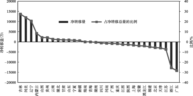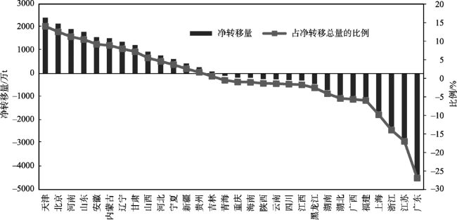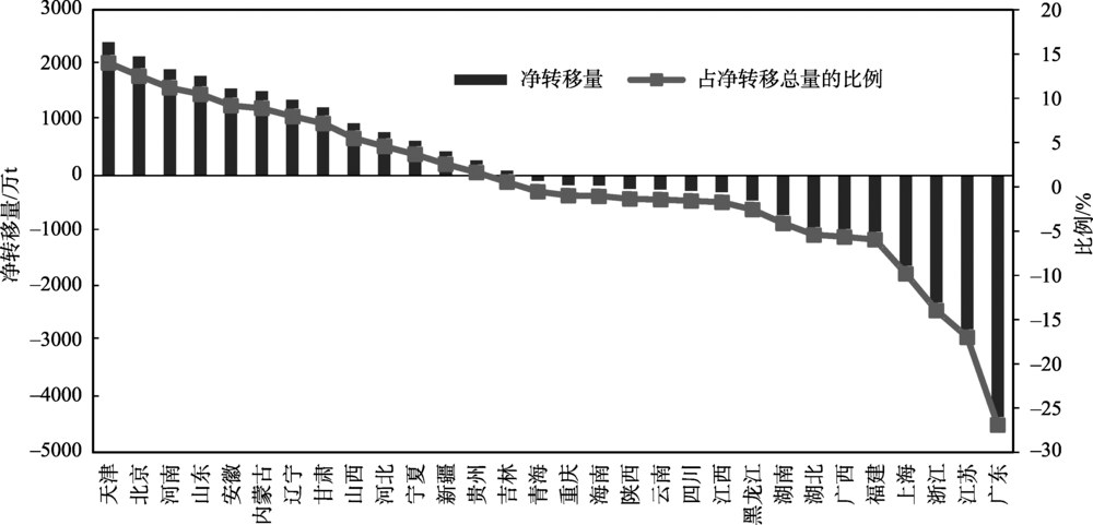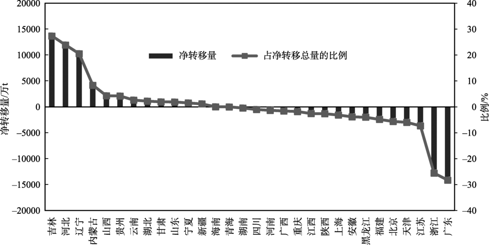 Fig.2 Provincial net carbon emissions embodied in interprovincial trade (CEs-PT) and their proportions to total net CEs-PT in 2007图2 2007年省际隐含碳净转移量及其占净转移总量的比例 |