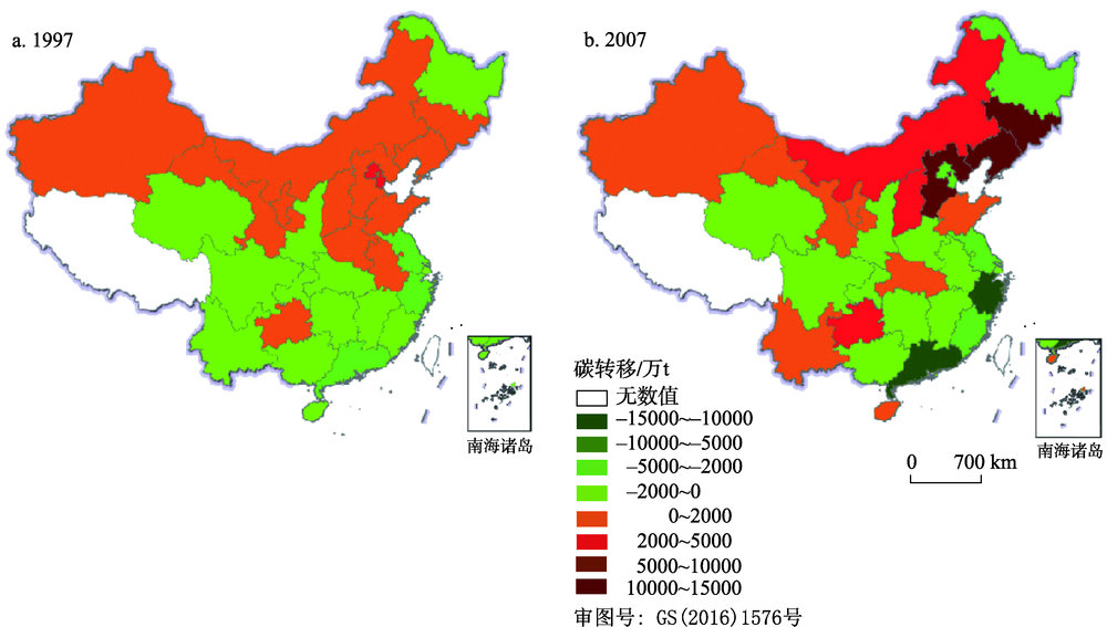 Fig.3 Geographic location of net carbon emissions embodied in interprovincial trade (CEs-PT), 1997-2007图3 1997-2007年省际隐含碳净转移时空演化情况 |