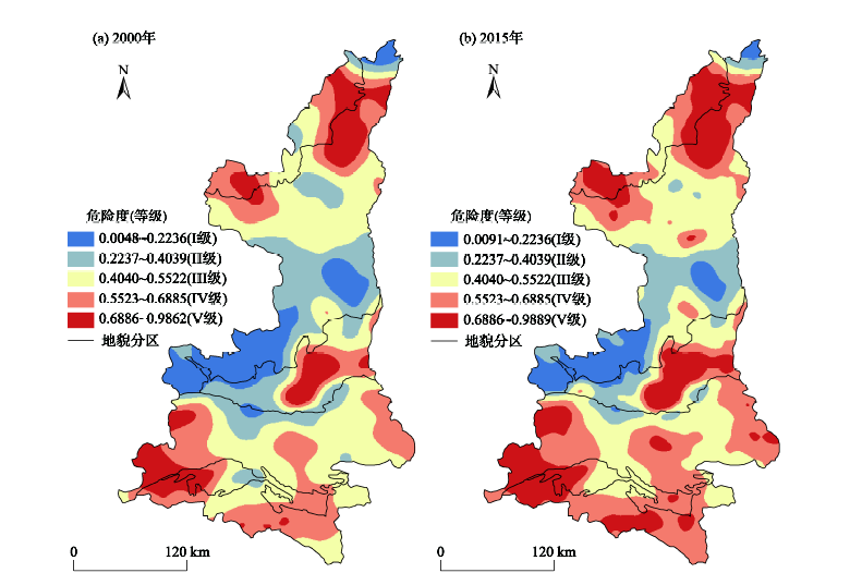 图2 2000—2015年陕西省多源危险度空间分布Fig.2 Spatial distribution of multiple hazards in Shaanxi Province, 2000-2015 |