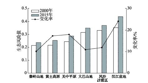 Land surface elements such as land use / land cover are in constant change and dynamic balance, driving the changes of global ecological processes and forming the regional differentiation of landscape, which cause many ecological risks under multi-source stresses. Based on a probability-loss risk model, a multiple hazards and potential ecological damage approach was used to construct a regional ecological risk evaluation system of Shaanxi Province. After identifying multiple hazard types from the perspective of geomorphologic regionalization, potential ecological damages were synthesized by taking landscape pattern and ecosystem services value losses as related factors. The spatial and temporal differentiation of individual risk factors and regional ecological risks in Shaanxi Province between 2000 and 2015 were analyzed. Meanwhile, the spatial and temporal changes of ecological risks were demonstrated from the perspective of geomorphologic regionalization and risk gravity model. Several conclusions were drawn from this analysis: 1) In 2000 and 2015, the multiple hazards index values of Shaanxi Province were 0.3837 and 0.4558, respectively, with an increase of 18.79%. Multiple hazards presented the spatial pattern of high in the north and south and low in the middle, with a W-shaped distribution along the north-south axis. Potential ecological damages were 0.5537 and 0.6270, up by 13.24%. Except for the southern part of the Loess Plateau and the eastern part of the Qinling Mountains, potential ecological damages were high. The regional ecological risks were 0.2429 and 0.2865, rising by 17.95%, and presented a spatial distribution pattern of "three high value areas sandwiched by two low value areas". 2) The ecological risks of the Qinling-Daba Mountains were low and the change rate of risks was small. The change rate of risks of the Loess Plateau and the sandification transitional zone was moderate, and the latter was facing a high risk. The Hanjiang Basin had the highest risks and the Hanjiang Basin and Guanzhong Plain took the first and second places in the change rate of risks, respectively. The risk gravity centers of the Loess Plateau and the sandification transitional zone both moved to the southwest, the risk gravity centers of the Guanzhong Plain and the Qinling Mountains moved significantly to the east, and the risk gravity centers of the Hanjiang Basin and the Daba Mountains jumped to the southeast.