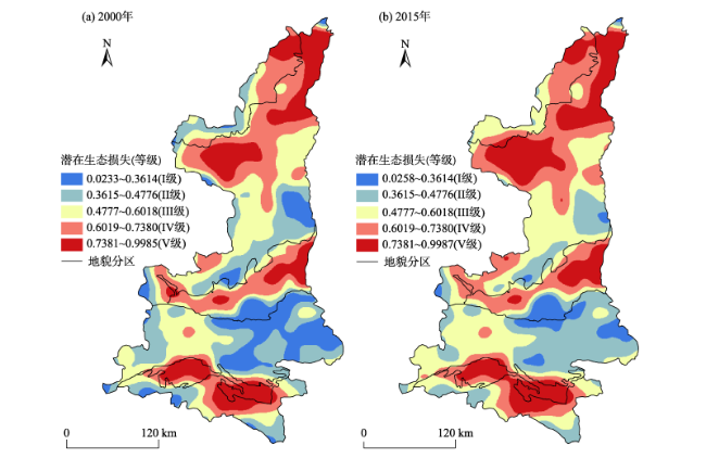 图3 陕西省2000—2015年潜在生态损失空间分布Fig.3 Spatial distribution of potential ecological damage in Shaanxi Province, 2000-2015 |