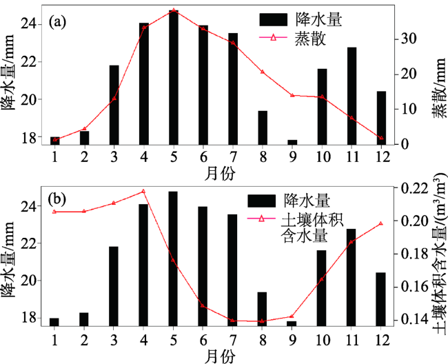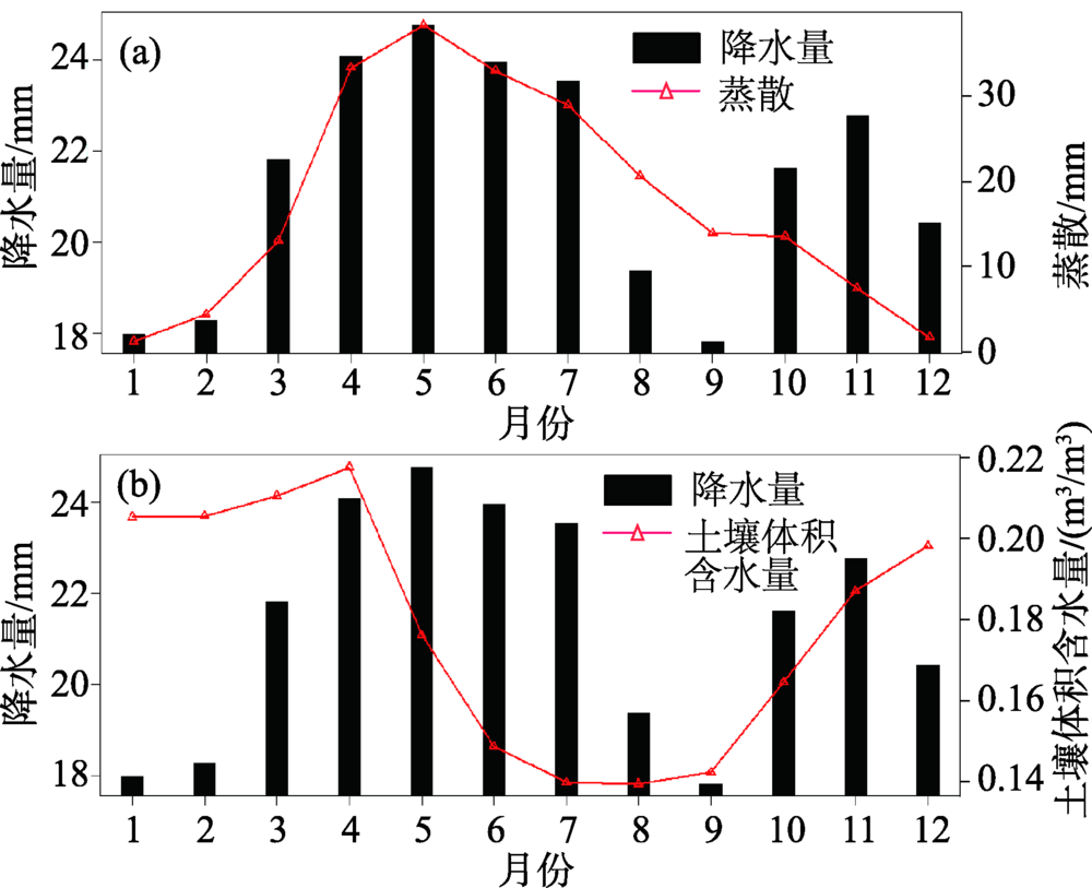 图10 不同月份降雨和地表蒸散、土壤含水量的对比Fig.10 Comparison between monthly precipitation and evapotranspiration (ET), soil moisture |