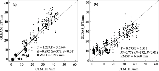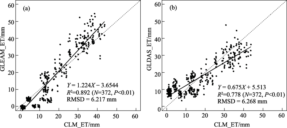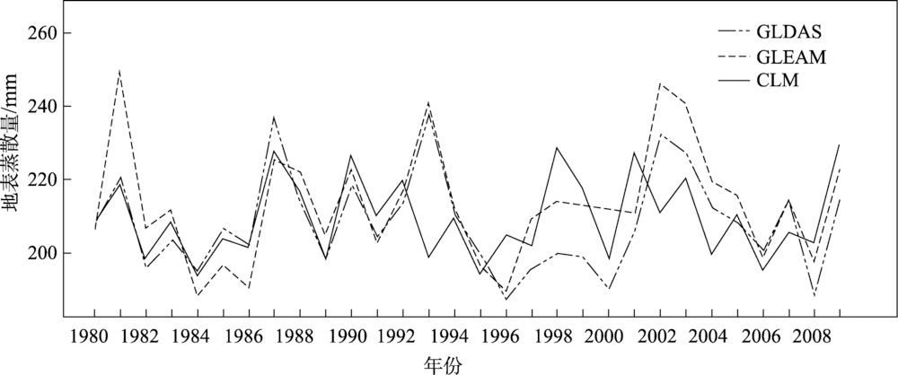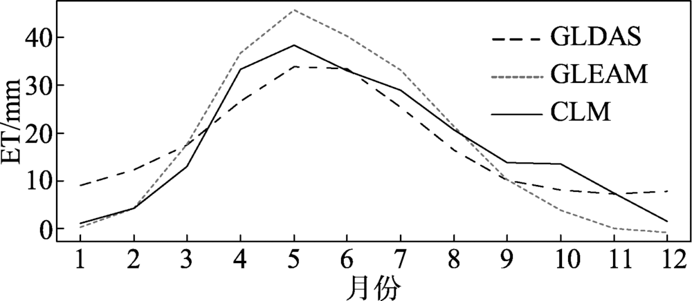 图2 1980—2009年CLM模拟的月平均地表蒸散(ET)与GLEAM和GLDAS地表蒸散产品的对比Fig.2 Scatter plot of monthly evapotranspiration (ET) between common land model (CLM) simulations and GLEAM, GLDAS products, 1980-2009 |