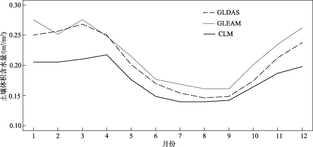 图6 3种数据土壤体积含水量的月均值对比Fig.6 Time series of monthly mean volumetric soil water content of the three products |