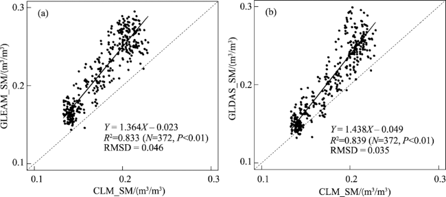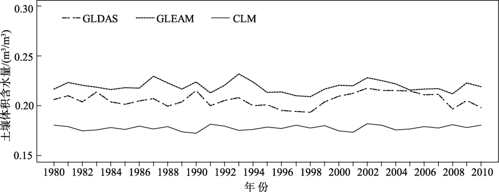图5 1980—2009年CLM模拟月平均土壤水分含量(SM)与GLEAM和GLDAS土壤水分产品的对比Fig.5 Scatter plot of monthly mean soil moisture (SM) between common land model (CLM) simulations and GLEAM, GLDAS products, 1980-2009 |