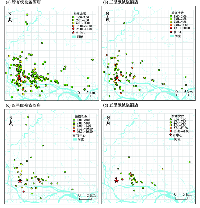 As a ticklish social problem, crime committed in hotels has been concerned by both Chinese and Western scholars. Theft is one of the most frequent crime types occurred in hotels, especially in star hotels. Previous studies on influencing factors of hotel theft cases mainly focused on star hotel and personal attributes of victims at the micro level from the perspective of sociology, rather than considering the built environmental factors at the macro level from the perspective of geography. Using the data on the star hotels with theft cases in 2012-2014 in ZG central city obtained from Municipal Public Security Bureau, this study examined the spatial-temporal characteristics of these hotels. Then the environmental indicators within 500 m around the hotels were examined and the negative binomial regression method was used to make a systematic analysis on the factors affecting the theft of different types of star hotels in various time periods. The main results are as follows: 1) The spatial-temporal distribution of star hotels showed obvious agglomeration features. Generally, most of the main hotspots in the high incidence areas of hotel theft were time invariant, all of them are highlighted near the old city central business district, the eastern extension of the main road and the railway station. However, the spatial distribution of secondary hotspots was time-varying. 2) The overall model analysis indicates that the improvement of the service level was the most effective way to reduce the theft cases of all star hotels. The surrounding property and community points of interest (POIs) will significantly increase the opportunity for all star hotels to be stolen, while road intersections play a significant regulatory role in the theft of all star hotels. 3) The results of the sub models demonstrate that the effect of service level on the theft of three-star and five-star hotels is significant, and the effect of road intersection on the theft of four-star hotels often used by guests of business travel is stronger; the number of POIs has more obvious effect on three-star and four-star hotels. Large-scale retail business center can significantly increase the number of theft cases in hotels in the peak season and the weekend, and the number of road intersections is significant for the monitoring of stolen risk of the star hotels in the off-season period and the working days. These results have shown that the built environment played a significant role in affecting the opportunity and cost of hotel theft. The results verify the applicability of the daily activity theory in the study of hotel crimes in large cities in China, and expand the research results of crime geography in the direction of star hotel theft, which has a guiding effect for the prevention of hotel theft.