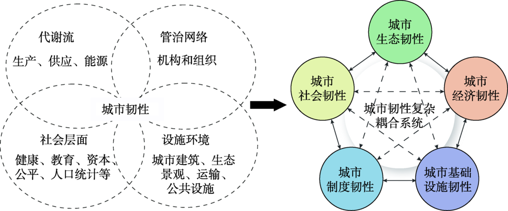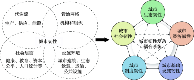 | 地理学 | 指城市系统及其所有组成部分的社会—生态和社会—技术网络在时间和空间尺度上受到干扰时保持或快速恢复所需功能、适应变化以及快速转换限制当前或未来适应能力的系统能力 | Sara等[36] |