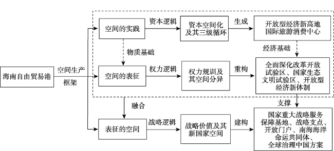 建设海南自由贸易港是党中央在新时代深化改革、扩大开放的一项战略举措。论文基于列斐伏尔的空间三元辩证法,结合海南自由贸易港建设的主要内容及其空间生产的特征,构建“资本—权力—战略”三维逻辑框架,以解析海南自由贸易港建设的空间生产逻辑:从资本逻辑看,海南自由贸易港具有资本空间化与空间资本化特征,在流动空间的作用下,其资本三级循环过程有利于推动海南自由贸易港建设国际旅游消费中心和开放型经济新高地;从权力逻辑看,海南自由贸易港构建了制度空间,能形成对政府权力的规训,推动海南建设全面深化改革开放试验区、国家生态文明试验区;从战略逻辑看,海南自由贸易港是新时代背景下“新国家空间”的一种形态,表征了国家重大战略服务保障基地、南海海洋命运共同体、全球治理中国方案等战略意义。论文运用空间生产框架从理论层面分析海南自由贸易港的地理学逻辑,能增进人们对中国改革开放实践的理解,对进一步深化改革和扩大开放具有参考价值。