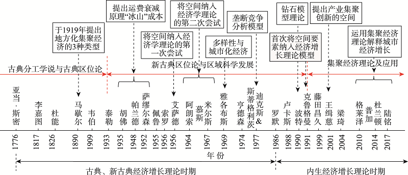 图1 集聚经济理论与经济增长的起源与发展注:① 图中所列学者为与集聚经济理论起源和发展相关的代表性学者,并未囊括所有古典、新古典区位论及经济增长学派的代表性学者;② 图中所列年份以代表性论著的出版年份为主,有少数年份为代表性论文发表年份,集中于1974—1990年;③ 图中古典与新古典区位论、区域科学理论和集聚经济理论的代表性论著详见1.1和1.2节,古典、新古典经济增长理论以及内生经济增长理论的代表性论著详见1.3节。 Fig.1 The origin and development of agglomeration economic and economic growth |