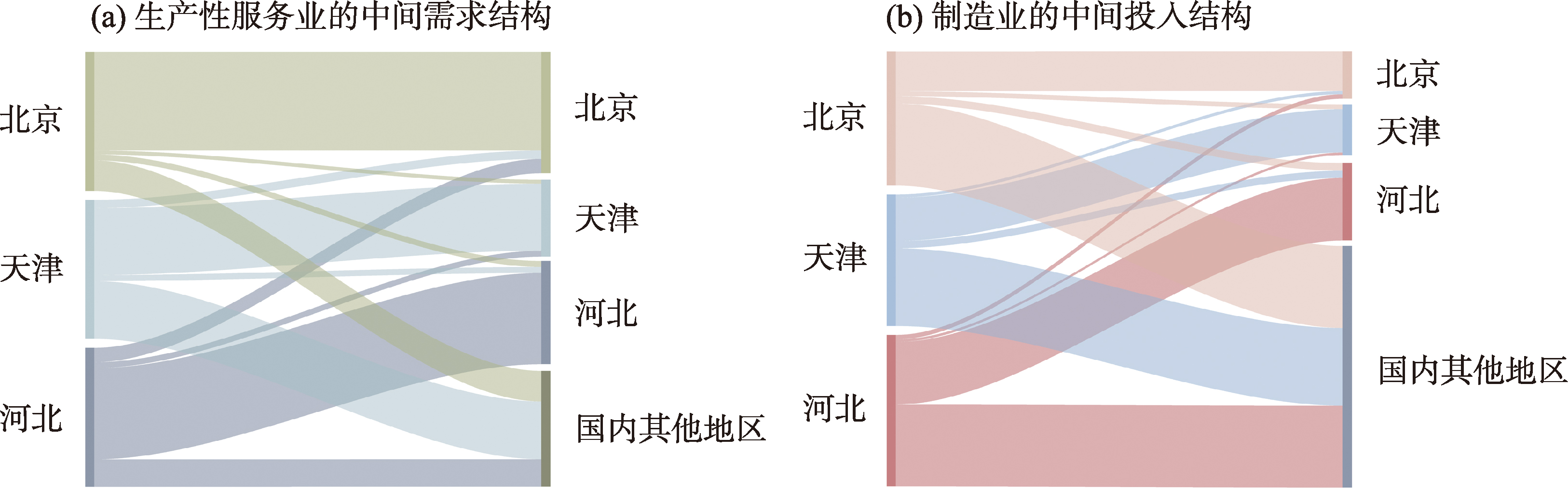 2014年以来,以一般性制造业为主要抓手的北京非首都功能疏解成为京津冀协同发展战略率先突破的重要领域之一,并取得了显著成效。但是,京津冀产业协同发展仍存在诸多问题,地区内经济差距不减反增。论文利用2017年京津冀地区间投入产出表和2003—2019年京津冀三省(市)面板数据,运用地区间投入产出分析法和联立方程模型,对京津冀三地间制造业与生产性服务业的产业互动关系进行了测度。结果表明:① 京津冀地区制造业和生产性服务业已形成显著的双向互动关系,整体从“供给主导”阶段步入“互动”发展阶段;但从投入产出联系来看,产业间互动水平较低,这可能是目前京津冀产业协同发展水平欠佳的主要原因之一。② 相比之下,北京生产性服务业对津冀地区制造业的推动作用较制造业更强,因此,加强北京生产性服务业的区域内流动,将是促进京津冀产业协同发展的重要途径。③ 高级服务要素在劳动和资本密集型制造业产业升级中发挥作用较弱。未来应继续加强京津冀三地在高技术产业领域的合作,特别是提高知识和技术密集型生产性服务业对制造业的投入水平。研究可为促进京津冀地区两大产业结构升级、互动发展提供经验证据,为缩小区域产业发展差距提供思路。