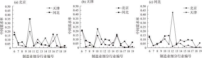 表4 京津冀三地间两个产业间的互动结构Tab.4 Structure of inter-industry interactions between the two industries in Beijing, Tianjin, and Hebei (%) |