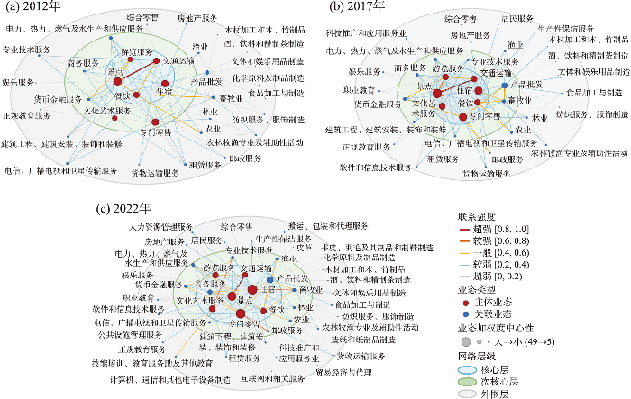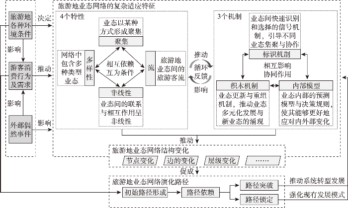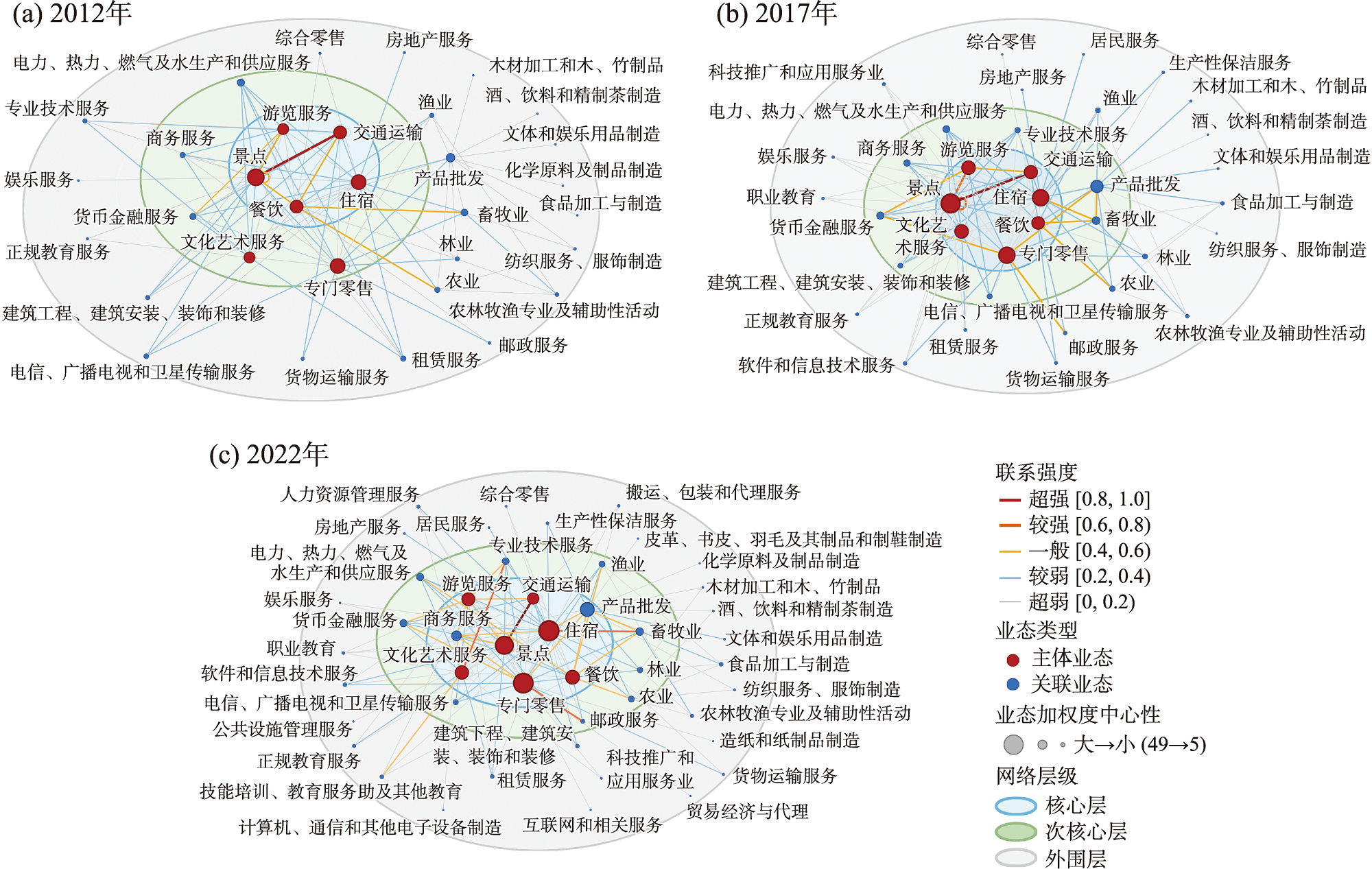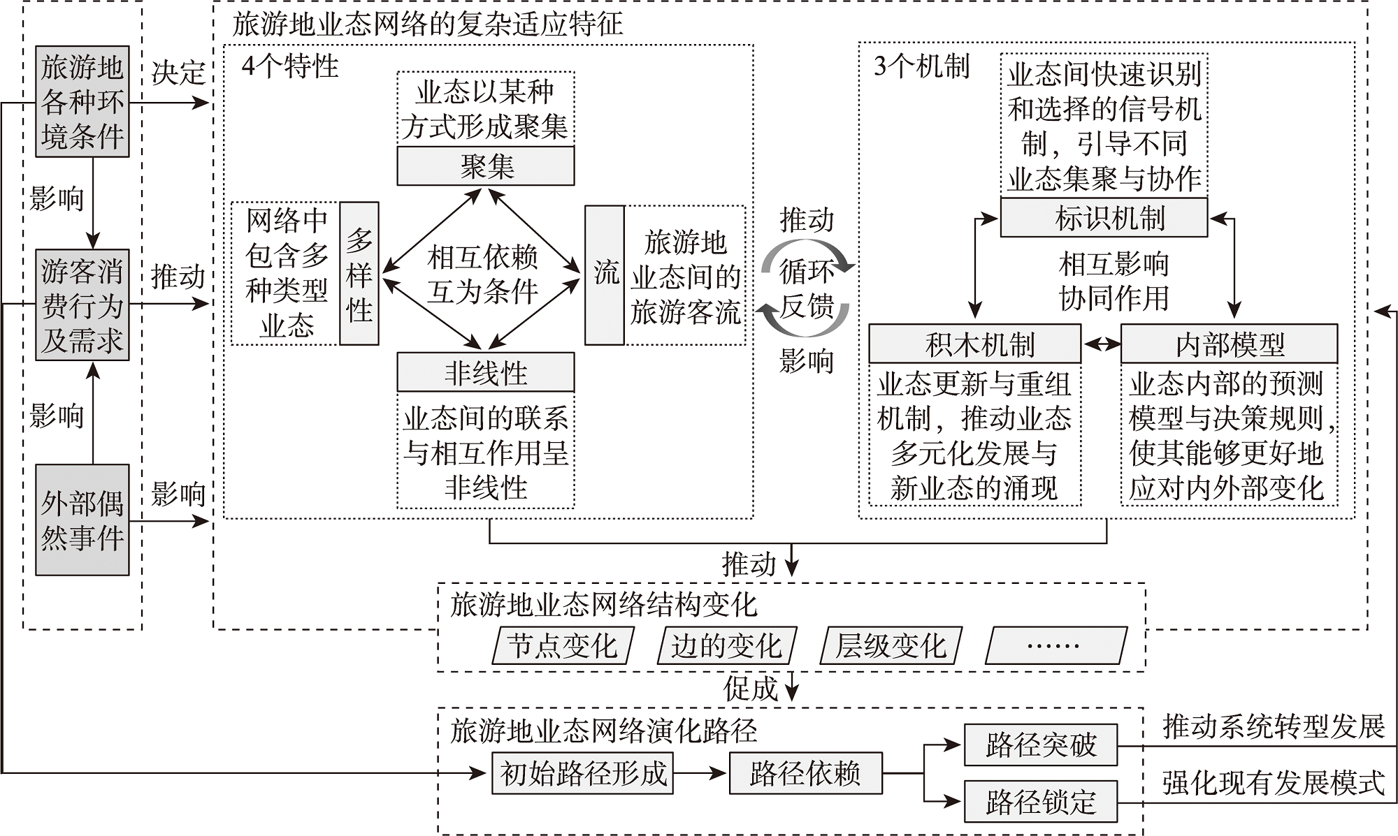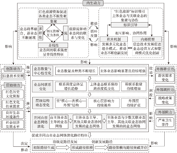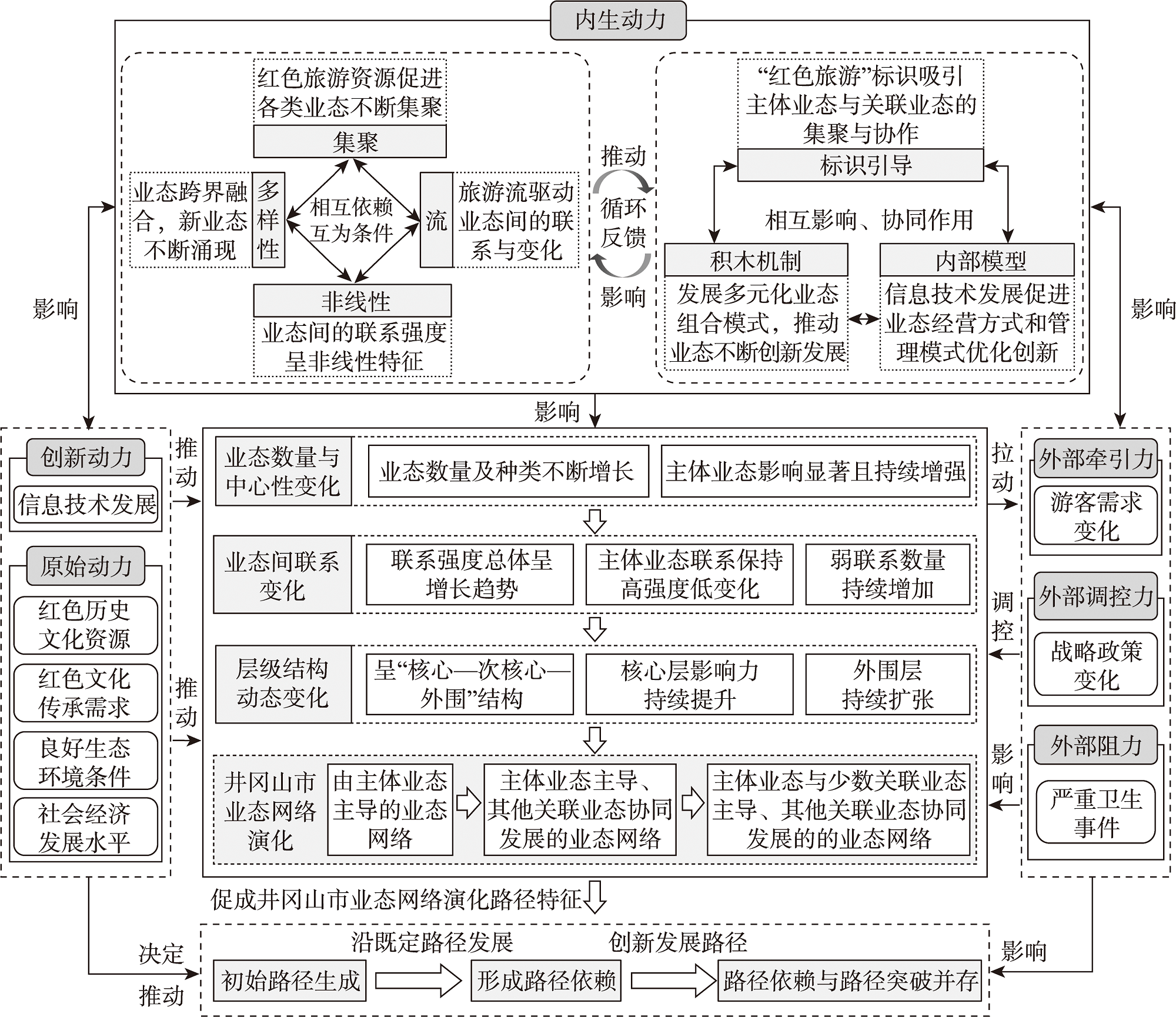 旅游地业态网络演化反映区域协调发展的动态特征,对其核心问题研究成为推动旅游地高质量发展的关键突破口。论文结合复杂适应系统理论、路径依赖理论和复杂网络理论,构建“复杂适应性—路径”研究分析框架。通过整合多源异构数据与多学科理论方法,形成一套完整的旅游地业态网络构建方法。引入路径依赖度和路径突破度指标,量化分析业态网络演化的路径特征。在此基础上,以井冈山市为例,深入揭示其2012—2022年旅游地业态网络演化特征与机制。结果表明:① 旅游地主体业态影响力突出,形成以“吃住行游购娱”等主体业态为主导、其他关联业态协同发展的网络格局;② 业态间的联系强度具有差异,业态网络呈高比例弱连接结构;③ 业态网络呈现“核心—次核心—外围”结构,层级结构持续动态优化;④ 业态网络演化路径特征由“路径依赖”向“路径依赖与突破并存”变化;⑤ 旅游地业态网络演化机制复杂,受到原始动力、创新动力、外部牵引力、外部调控力、内生动力与外部阻力共同影响。旅游地业态的协同发展提供理论依据和案例借鉴。