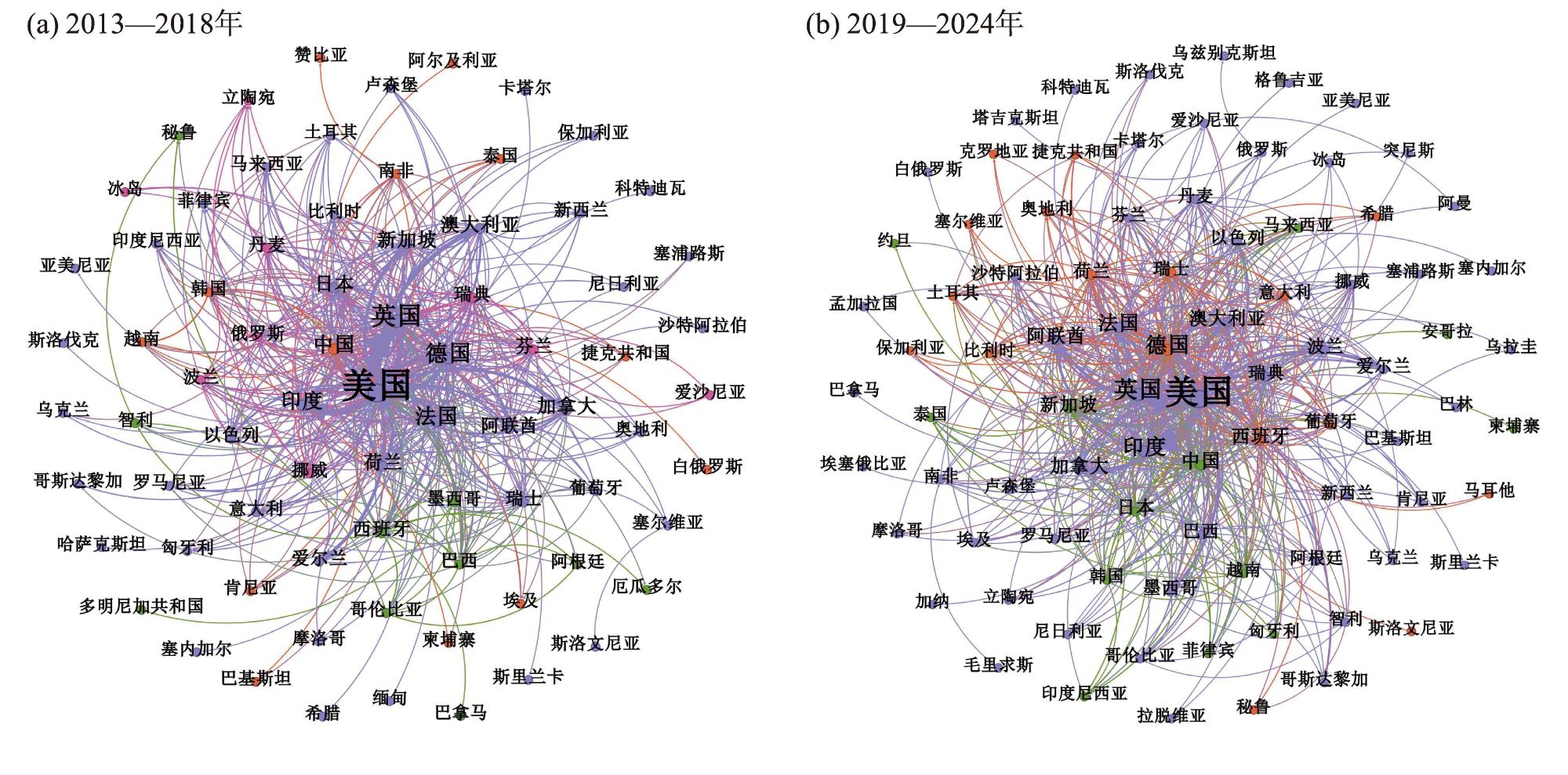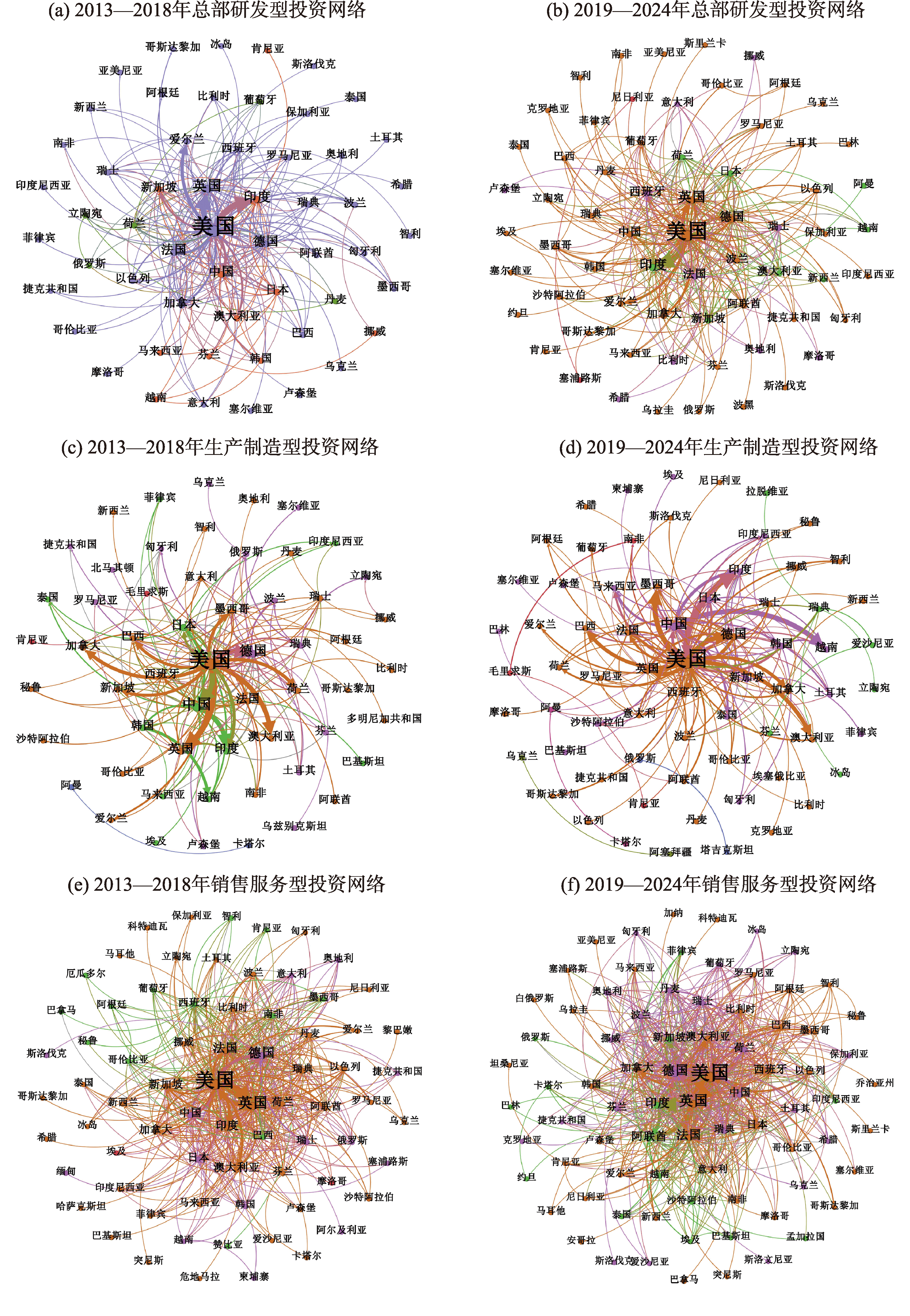 图4 2013—2024年全球ICT产业绿地投资网络注:节点表示网络中的投资主体,节点及其标注字体大小与加权度中心性成正比;边表示节点间的绿地投资联系,边的粗细与投资权重成正比,边的颜色与发出节点颜色一致。下同。 Fig.4 Global greenfield investment network in the ICT industry during 2013-2024 |