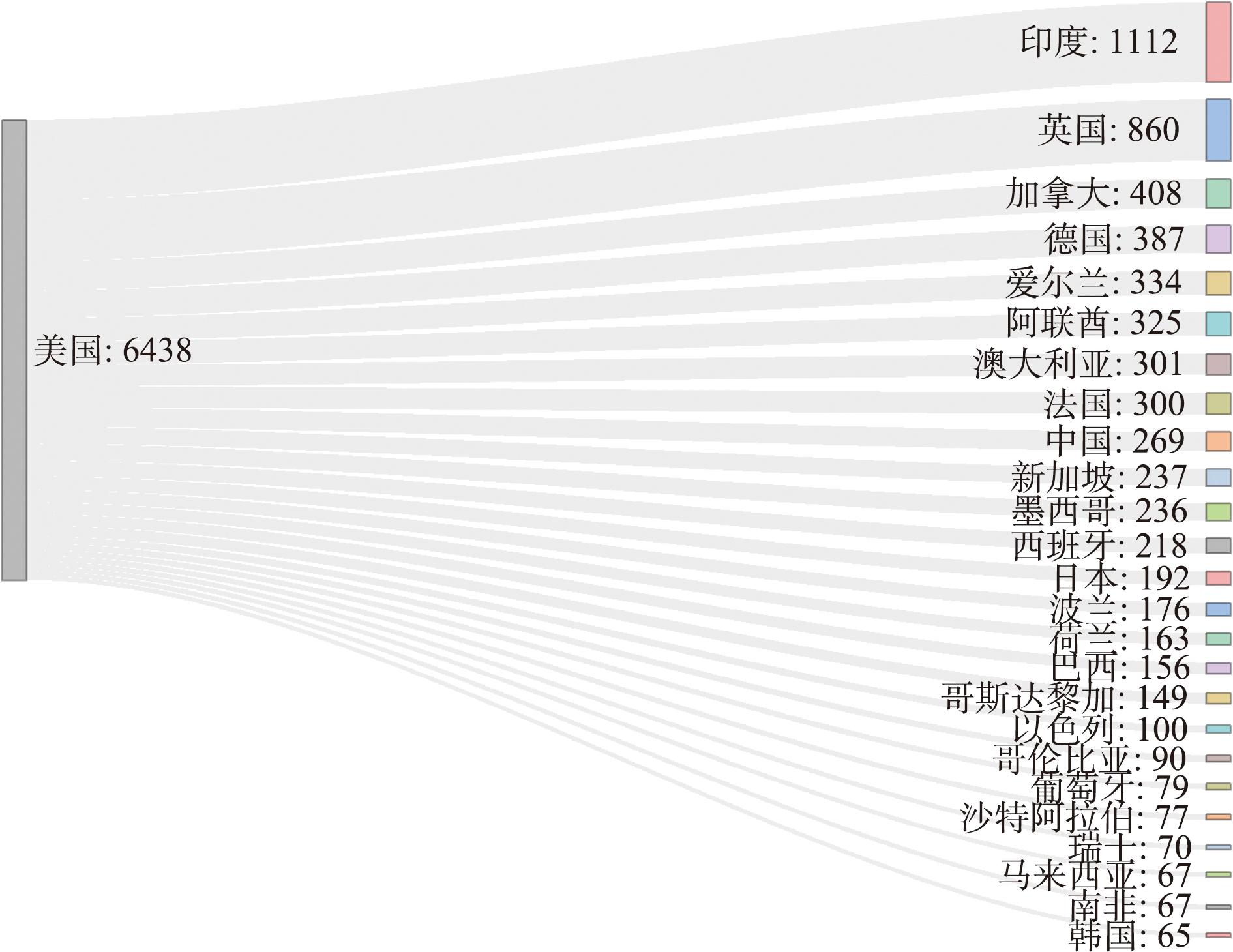 | 依赖区 (S≥1.0) | 美国(6.33)、英国(2.80)、德国(1.05) | 3 | 美国(5.10)、英国(2.69)、瑞士(2.08)、法国、德国、加拿大 | 6 | 印度(3.54)、美国(1.78)、墨西哥(1.59)、德国、南非、巴西 | 6 | 印度(4.67)、美国(3.24)、阿联酋(2.68)、土耳其、德国、巴西、英国、西班牙、泰国 | 9 | |||