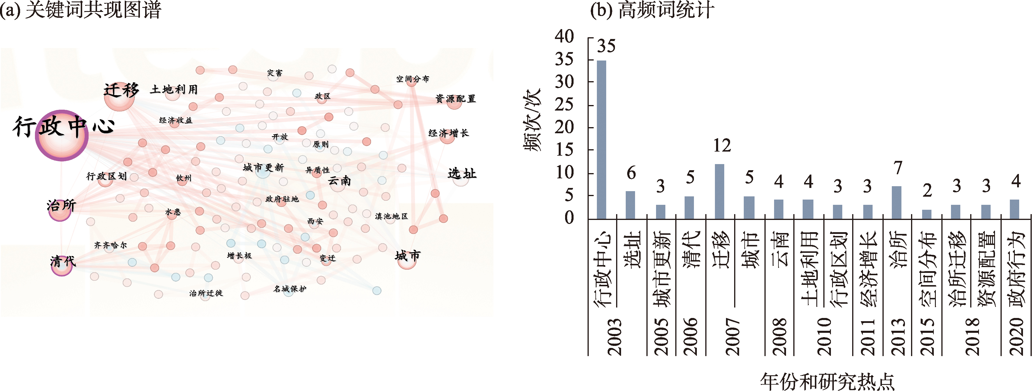 国内行政中心迁移研究关键词共现图谱和高频词统计