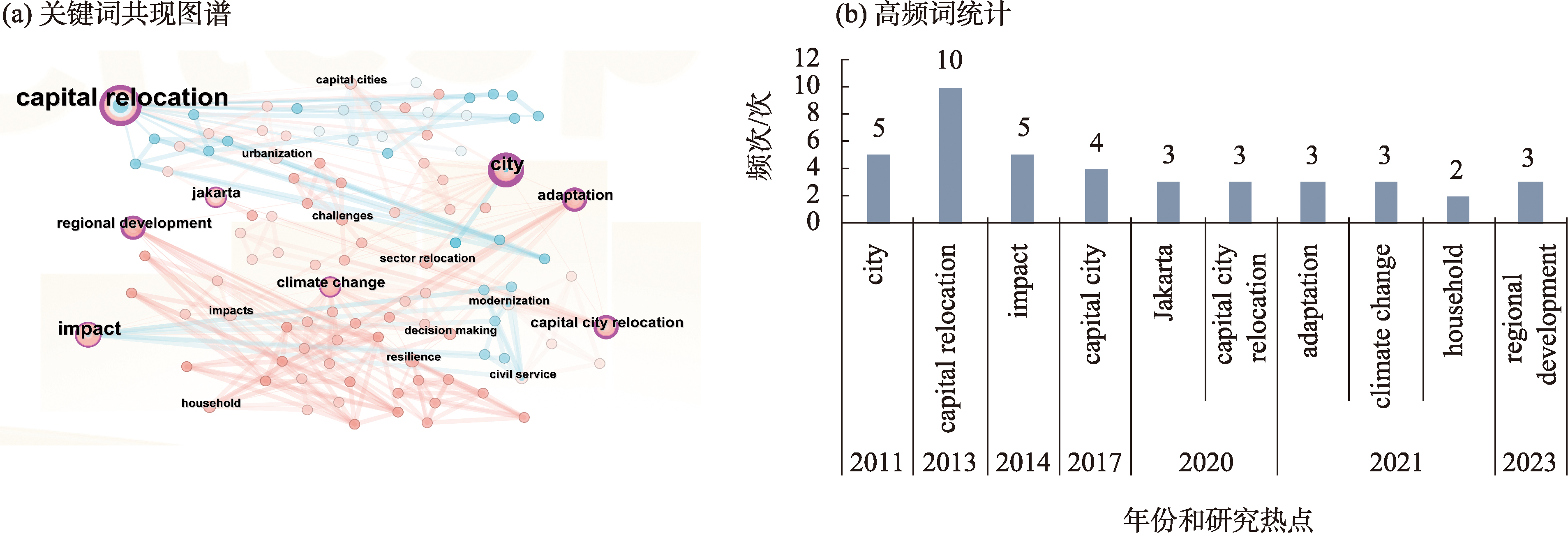 国外行政中心迁移研究关键词共现图谱和高频词统计