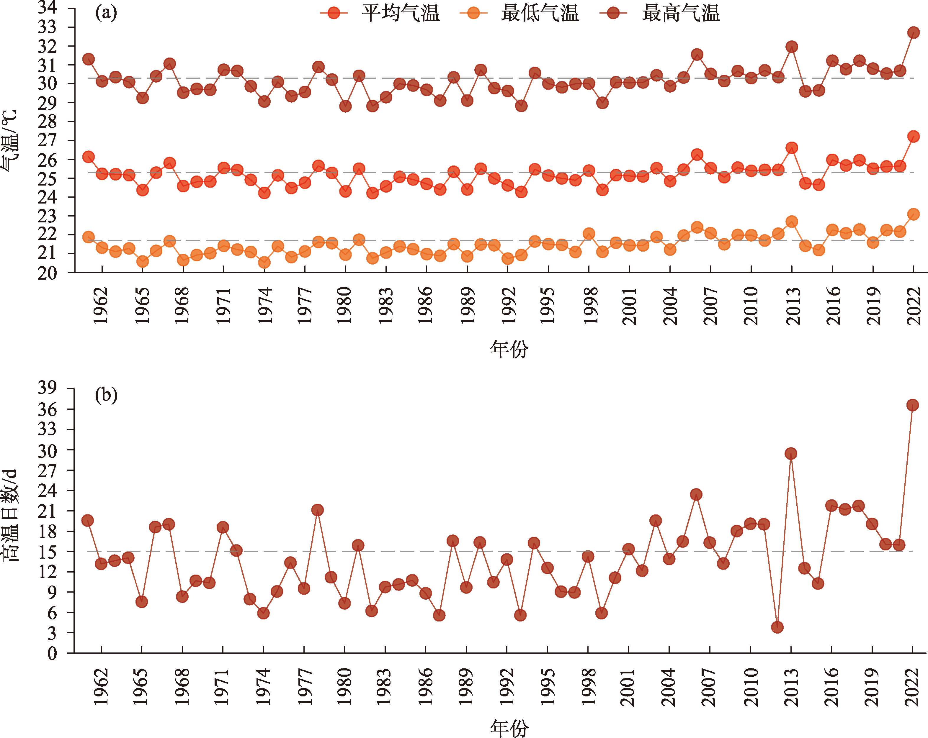 1961—2022年夏季长江流域夏季气温和高温日数的逐年变化