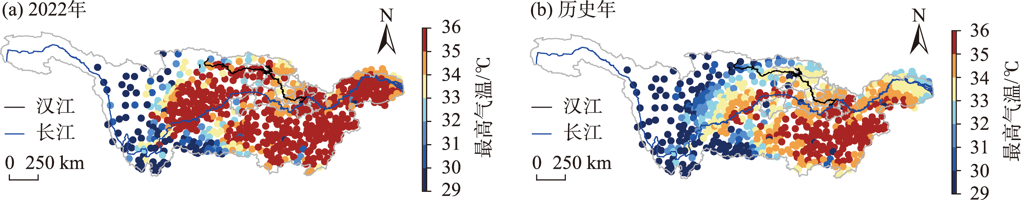 长江流域2022年夏季高温过程期间日数距平分布