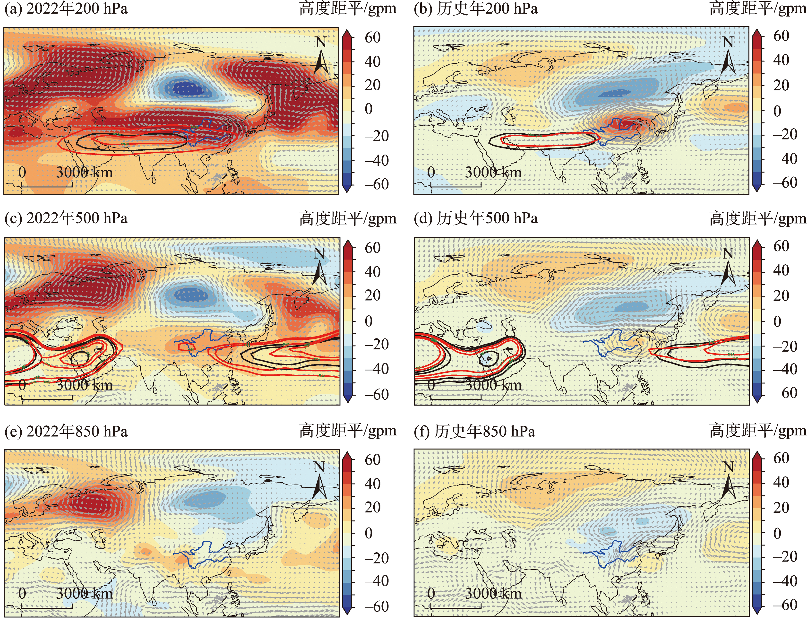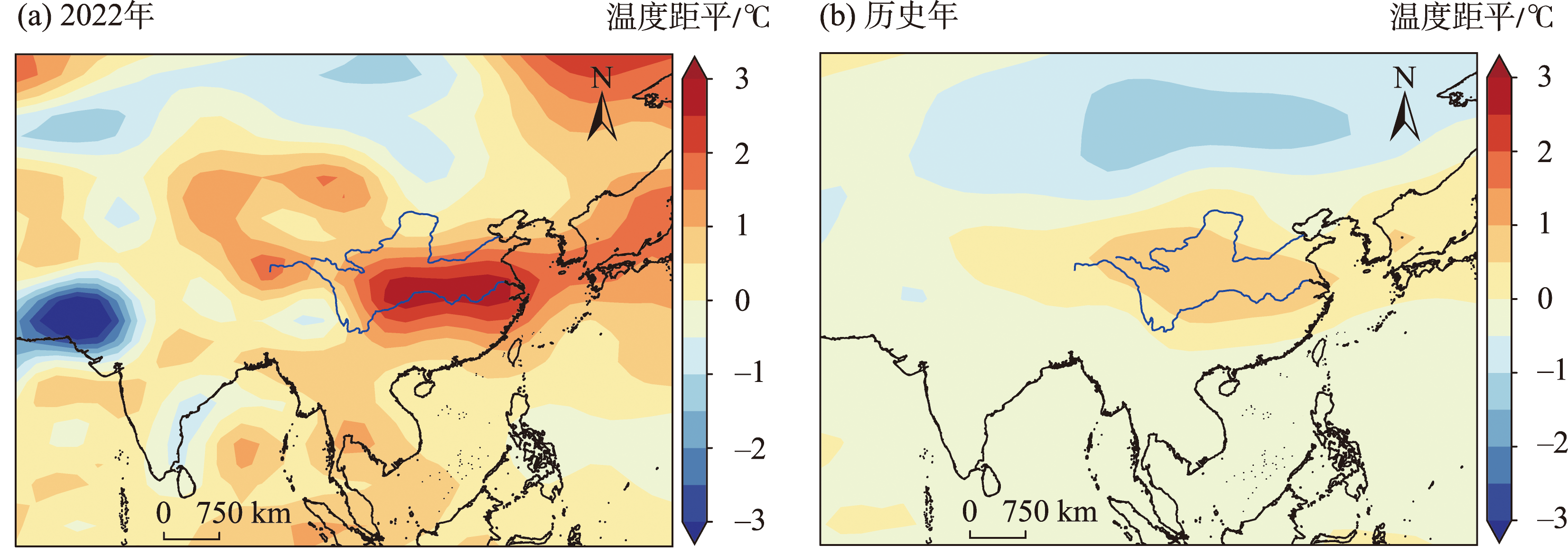 注:图a中红线为2022年,黑线为气候平均;图b和c中红色表示气候平均,蓝色填色为2022年。