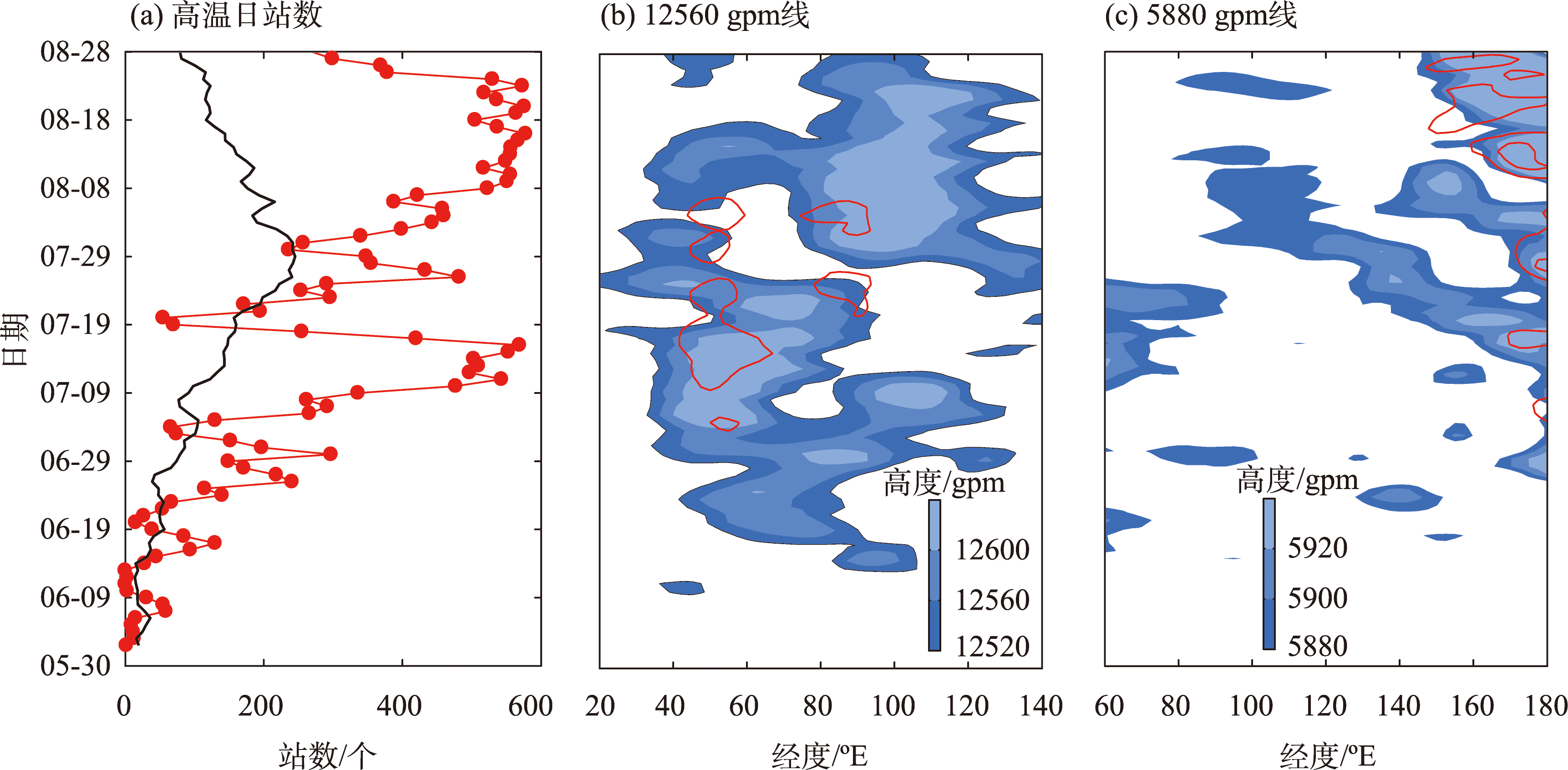 2022年6月1日—8月28日逐日高温日站数及27.5°~40°N平均纬向平均的12560 gpm线和5880 gpm线的逐日演变