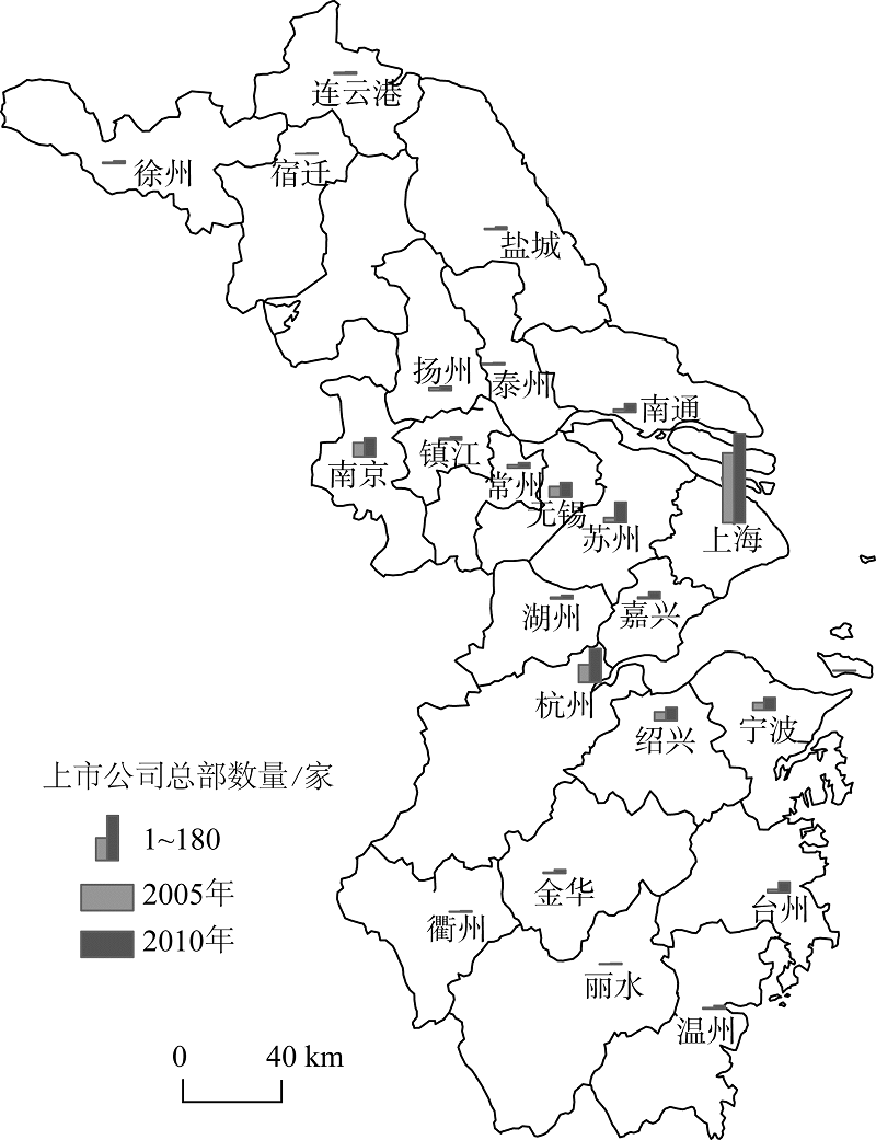 Fig. 1 Regional structure of listed companies headquarters in the Yangtze River Delta(source: list companies network database of YRD, the same below)图1 长三角上市公司总部地域结构(资料来源:长三角上市公司企业网络数据库,下同) |