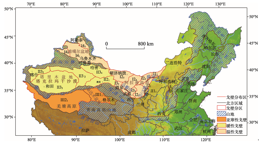 Fig.1 Division of stony deserts and distribution of mountainous areas in northern China图1 中国北部区域戈壁分区与山地分布图 |