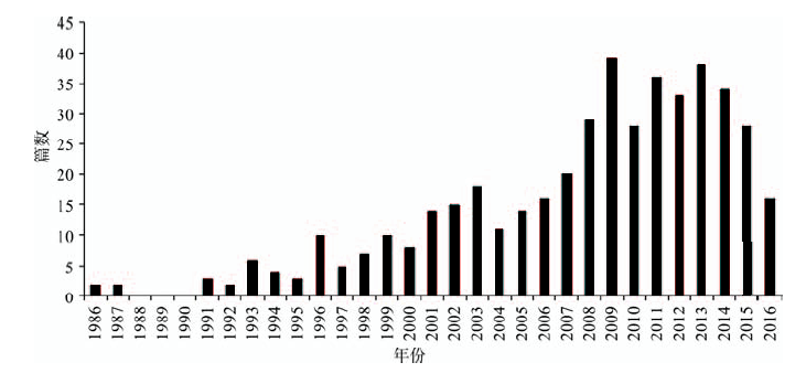 Fig.1 Annual distribution of international literature on national parks, 1986-2016图1 1986-2016年国外国家公园领域研究文献数量年度分布 |
