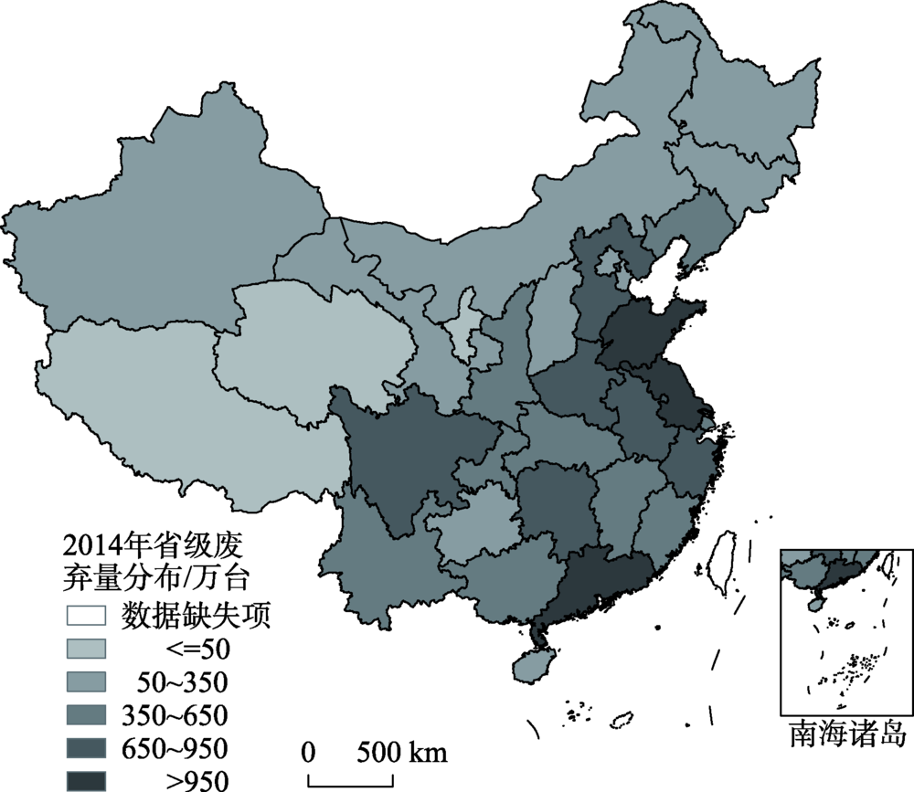 Fig.1 Spatial pattern of e-waste generation in China, 2014图1 2014年中国强制回收的五种废弃电器电子产品产生量的空间分布 |