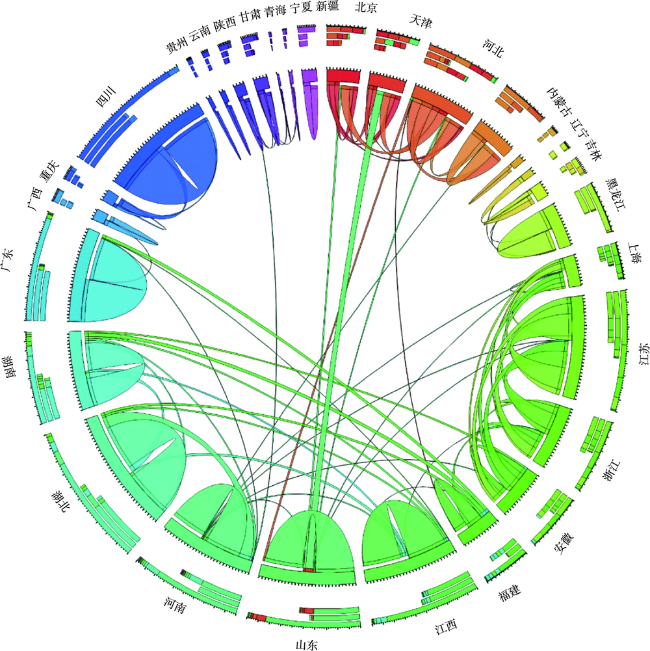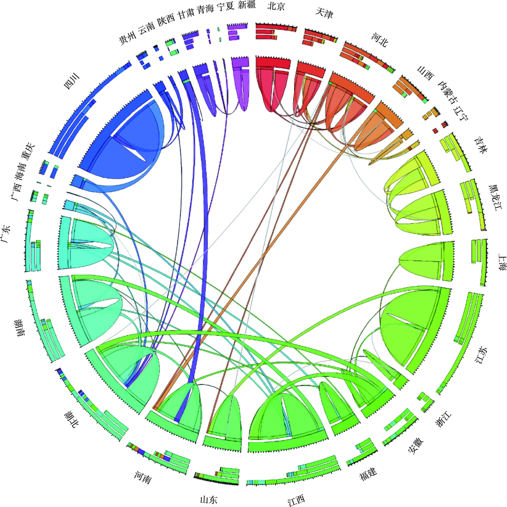 Fig. 3 Interprovincial flows of e-waste in China in 2014 estimated with the spatial interaction model图3 根据空间相互作用模型估算的中国2014年电子废物的省际流动状态 |