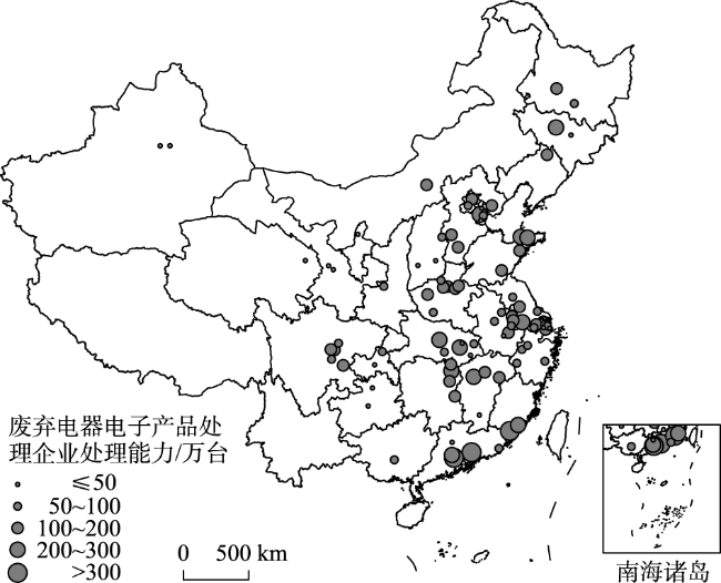 Fig.2 Spatial distribution of formal e-waste recycling capacity in China, 20142014年中国正规废弃电器电子产品处理能力空间分布 |