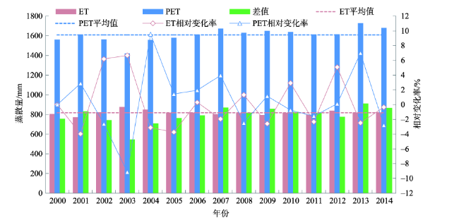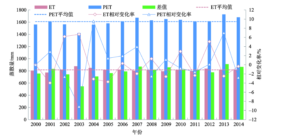图9 2000—2014年山西省ET、PET多年变化趋势Fig.9 Trend of change of evapotranspiration (ET) and potential evapotranspiration (PET) in Shanxi Province, 2000-2014 |