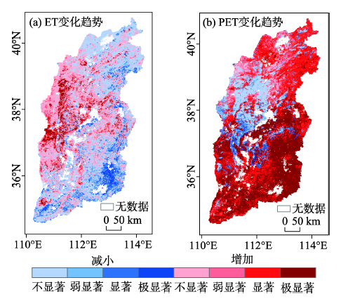 表1 2000—2014年山西省ET、PET变化趋势及显著性统计Tab.1 Statistics on the trend and significance of evapotranspiration (ET) and potential evapotranspiration (PET) in Shanxi Province, 2000-2014 |