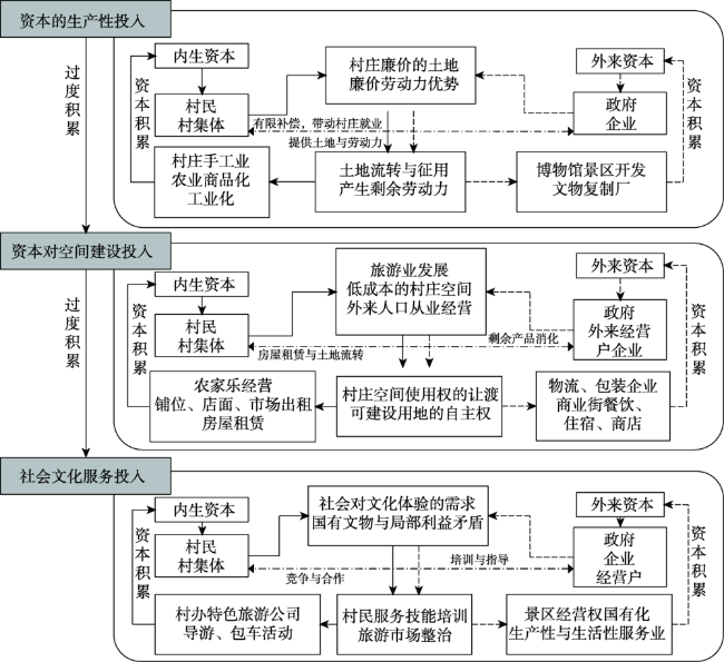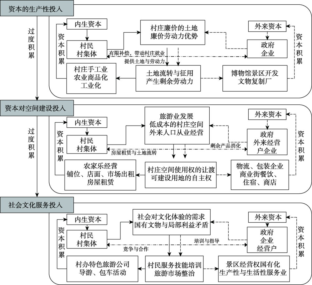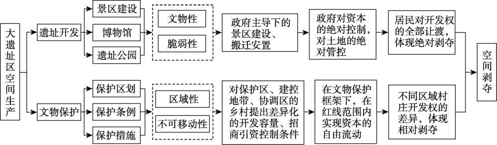 As more than 80% of the sites in the list of China's Great Relics Sites are located in suburban or rural areas, relics protection and tourism development will inevitably affect the rural social space around the heritage areas. Analysis of the patterns of social and economic development is the key to achieving the rural revitalization strategy. This study took the heritage area of Qin Shihuang Mausoleum as a case study area and used questionnaire, face-to-face interview, field survey, and other methods to examine the development of rural society around the area in the past 30 years. The study transformed the traditional society-space binary opposition analysis and constructed the society-space dialectical analysis method based on the Space Production Theory and David Harvey's Capital Circulation Theory to explore the mutual feedback mechanism of society and space in the countryside around the heritage area of the Qin Shihuang Mausoleum under the influence of capital. The results show that: 1) The flow of capital to the optimal location results in the differentiation of rural social space in the study area. Due to the differences in the natural environment, traffic conditions, constraints of protection zones, and the distance from the developed heritage sites, the selective investment of capital has resulted in the differentiation of rural social space in the heritage area. 2) The adjustment of rural production mode is the internal driving force of the evolution of social space in the heritage area. Under the framework of cultural relic protection, rural social space production in the relics area is a process in which the positive externality of tourism development promotes the capital flow to adjust the rural production mode, thereby affecting the social relations. 3) The government policy to the restriction of capital access in the heritage area is an external factor. The vulnerability of cultural relics in the heritage area determines that the government's strong intervention must be guaranteed in the process of display and utilization. The transformation of rural production mode that may lead to the conflict between protection and development requires the intervention of the governments, further affecting the adjustment of rural production mode. The spatial production of rural social space in the heritage area is a process of dynamic evolution and spiral rise. Only by the effective management of the government and reasonable participation of the market and rural community can we guarantee the rational development and transformation of rural communities in the heritage area.