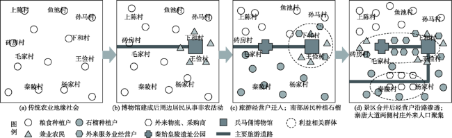 | 村庄旅游服务设施用地增加,体现景观符号化特征 | 手工艺品制作与旅游接待 | 兵马俑博物馆 | 王俭村、下和村 |