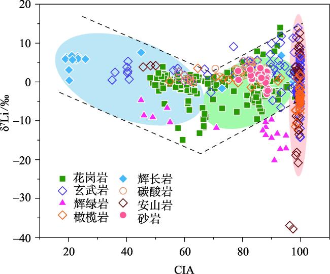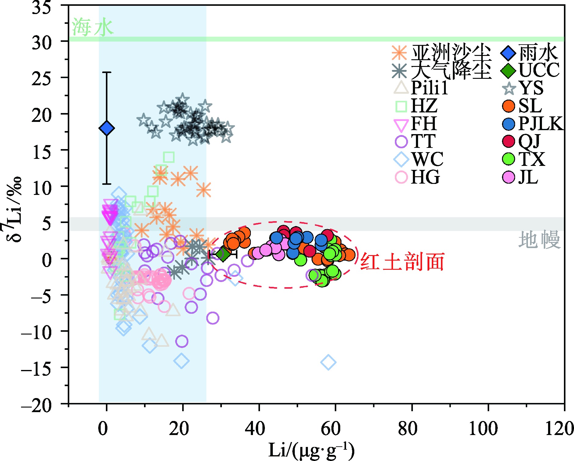 图5 高风化地区基岩风化壳、红土、黄土等地质储库的δ7Li值与Li含量图注:数据引自文献[28,34-35,46,49,59,73,75,77,82,91,114];QJ、PJLK、TX、JL为课题组未发表数据;HG为广东雷琼玄武岩风化壳样品,由于其δ7Li值与Li含量之间的关系与文中所述的分布模式不符,因此未在文中列出。 Fig.5 δ7Li value versus lithium content of geological reservoirs such as weathered crust of basic rock and red earth and loess in high weathering area |