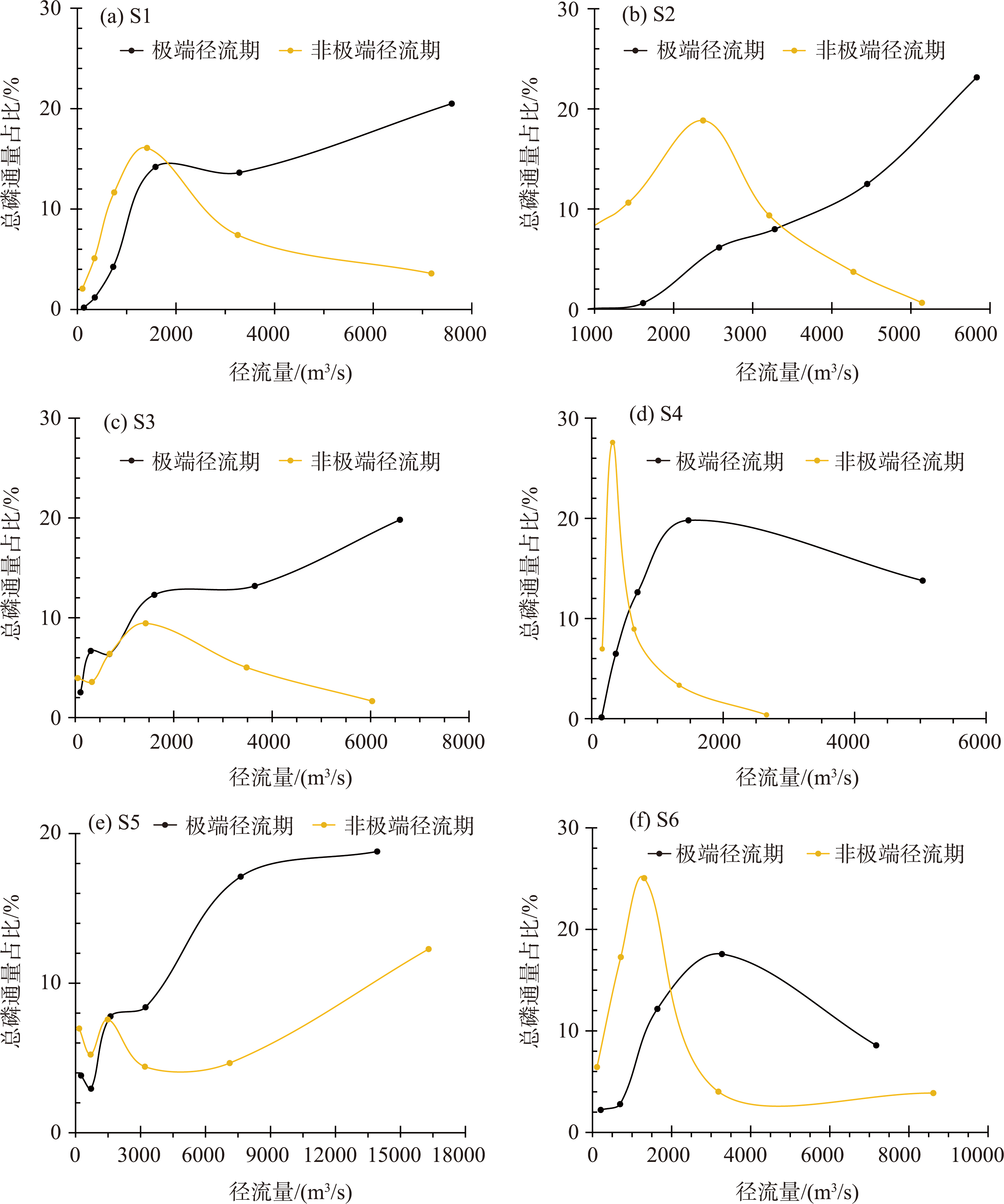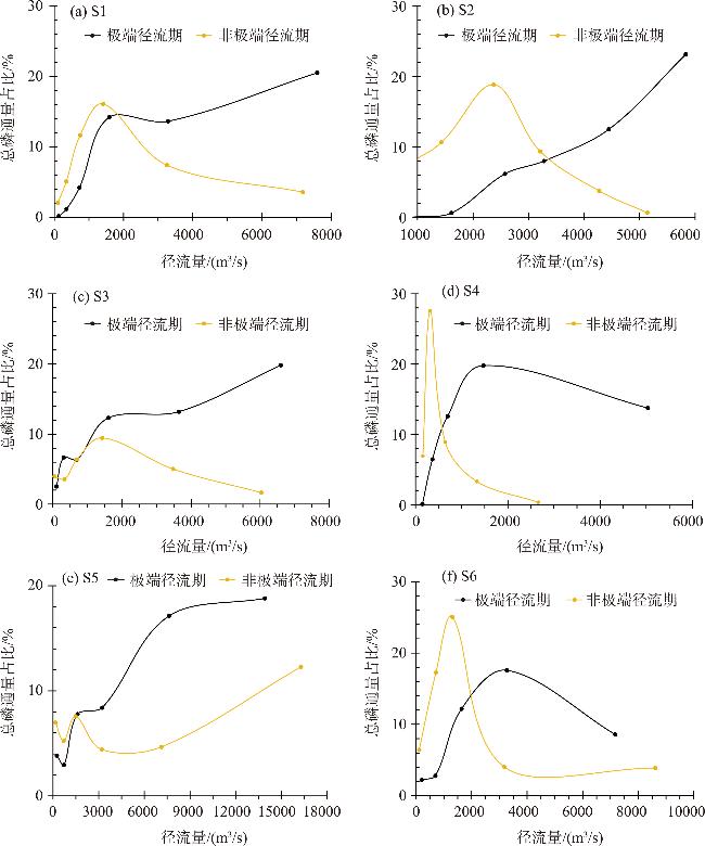 图4 长江各子流域极端径流期和非极端径流期总磷通量占比注:横坐标为非极端径流期、极端径流期径流区间内所有数据点径流量的均值,纵坐标为径流区间内所有数据点总磷占比之和,线为平滑线。 Fig.4 Proportion of total phosphorus flux in extreme runoff period and non-extreme runoff period in each subbasin of the Yangtze River Basin |