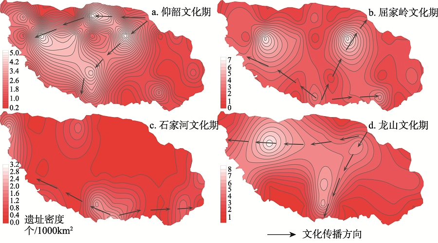| 图5 南阳盆地史前人类遗址密度与文化传播方向 (a. 仰韶文化传播路径; b. 屈家岭文化传播路径; c. 石家河文化传播方向; d. 龙山文化传播路径) |