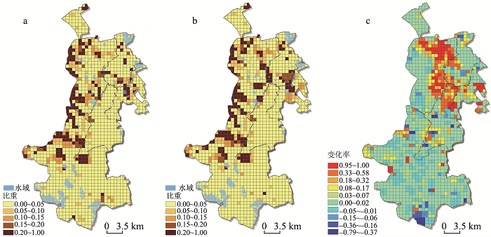 | 图3 大庆市区第二产业用地比重图 (a)1996年(b)2010年及(c)1996-2010年变化率图 |