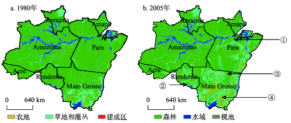 | 图2 1980年和2005年土地利用类型及森林砍伐严重区域位置示意图 |