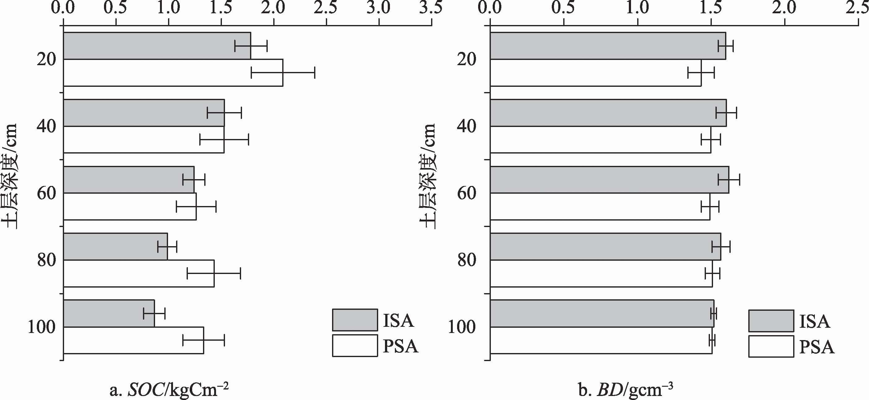 | Fig.4 Vertical distribution of bulk density and soil organic carbon of soils in the northern Tianshan urban cluster |
