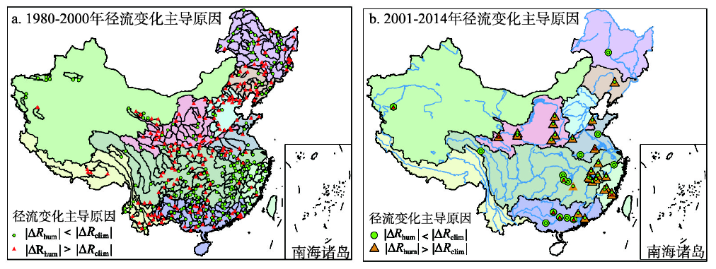| 图6 气候变化和人类活动对中国各大流域径流变化贡献率相对大小对比空间分布 |