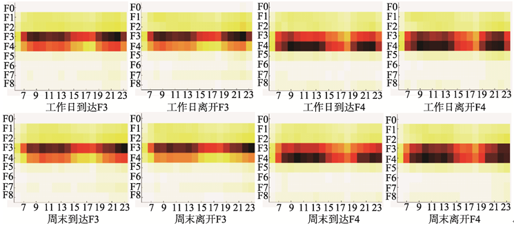 | 图6 工作日和周末到达与离开区域F3,F4 |