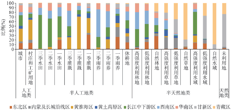 | Fig. 3 Proportion statistics on the second-level land use intensity at regional level in China in 2000 |